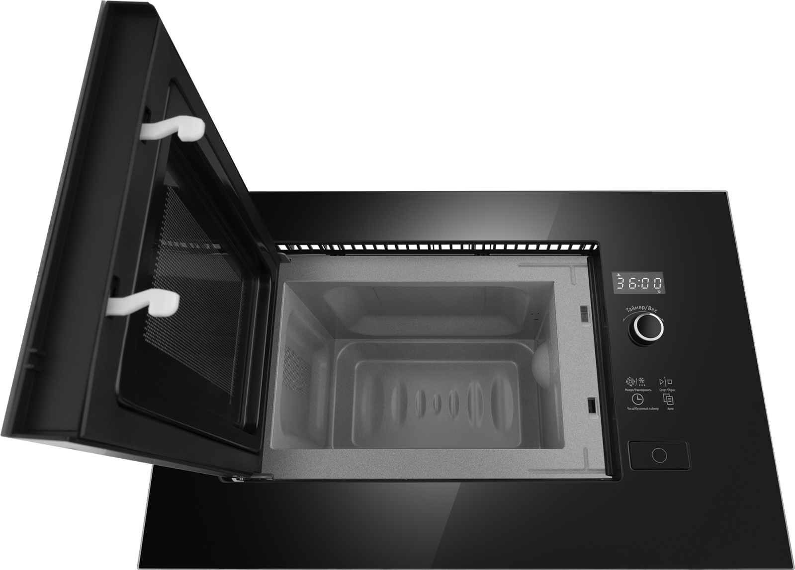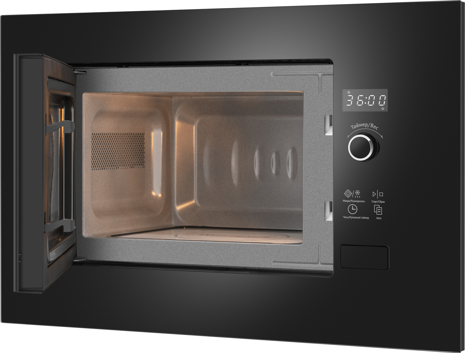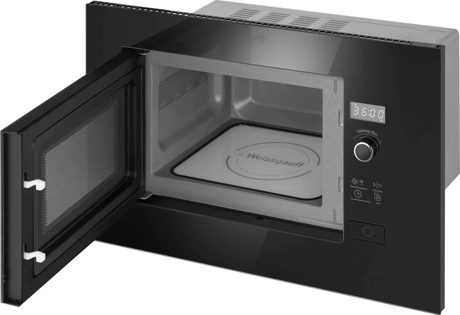 Встраиваемая микроволновая печь Weissgauff в чёрном цвете равномерно разогревает еду без поворотного стола, благодаря системе Spiegel и биокерамическому покрытию White Flat Ceramic.