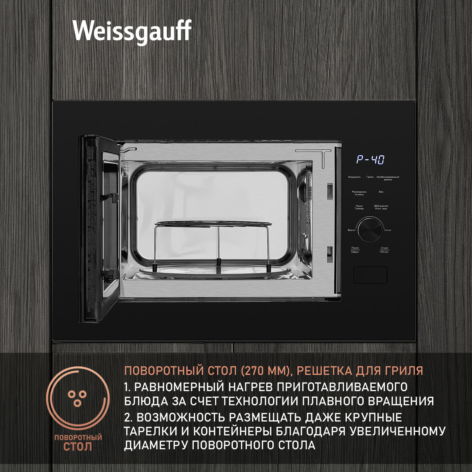 Поворотный стол диаметром 270 мм не только обеспечивает равномерный прогрев блюда со всех сторон, но и удобно извлекается из камеры, делая легкими его очистку и уход