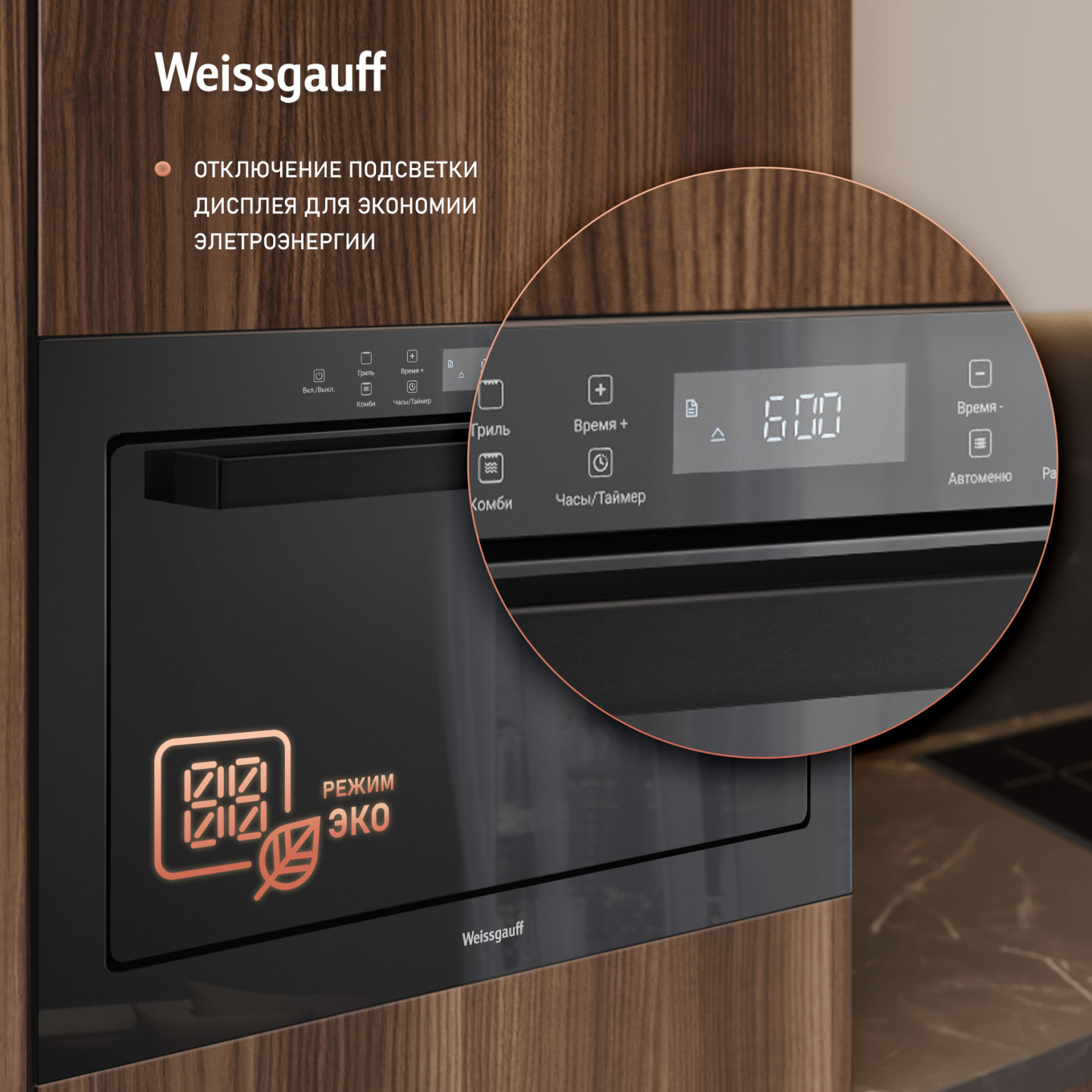 • "ЭКО" режим позволяет свести к минимуму энергопотребление микроволновой печи, когда она находится в режиме ожидания. Снижение энергопотребления происходит не в ущерб скорости или качеству приготовления продуктов, поскольку опция работает только во время ожидания.