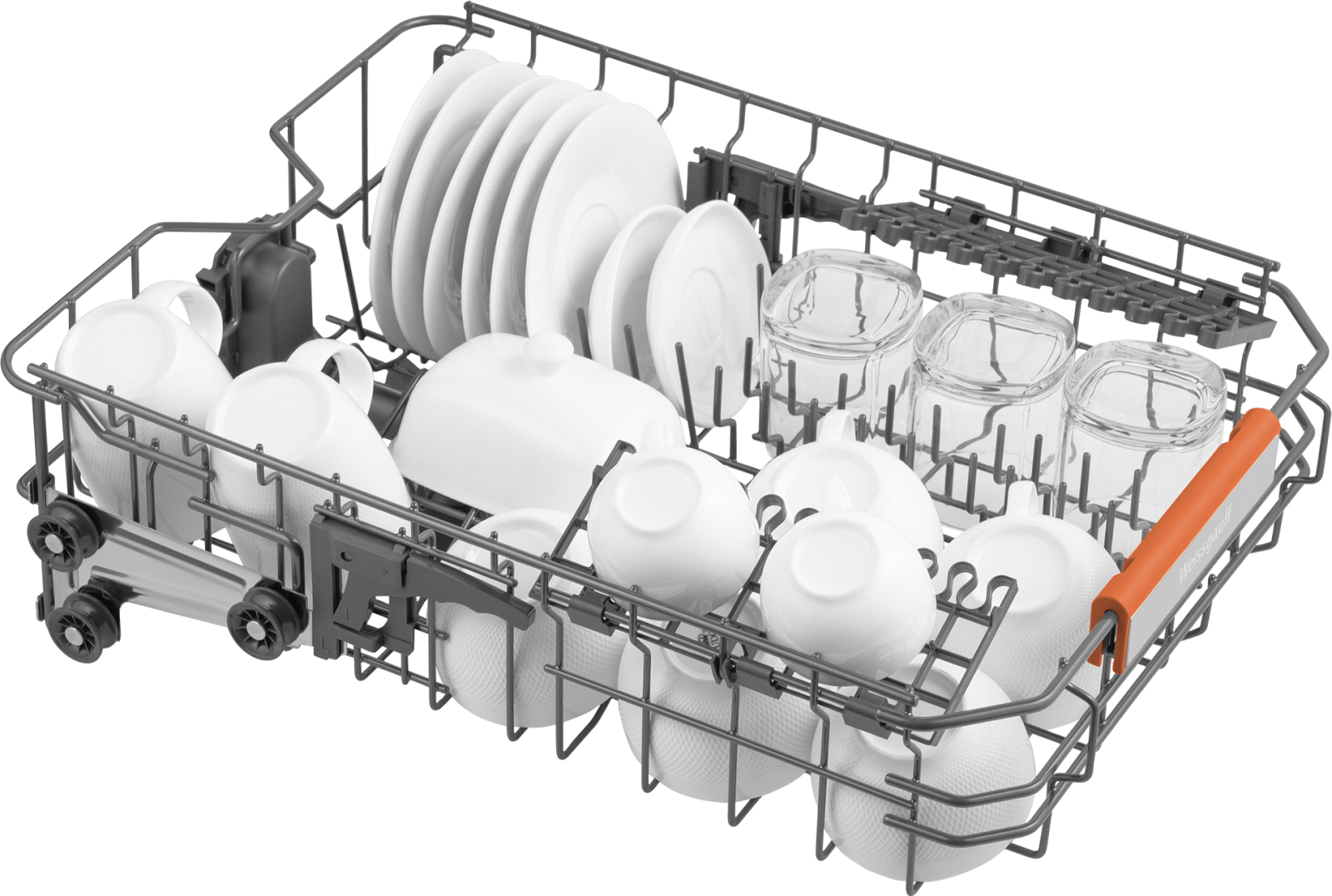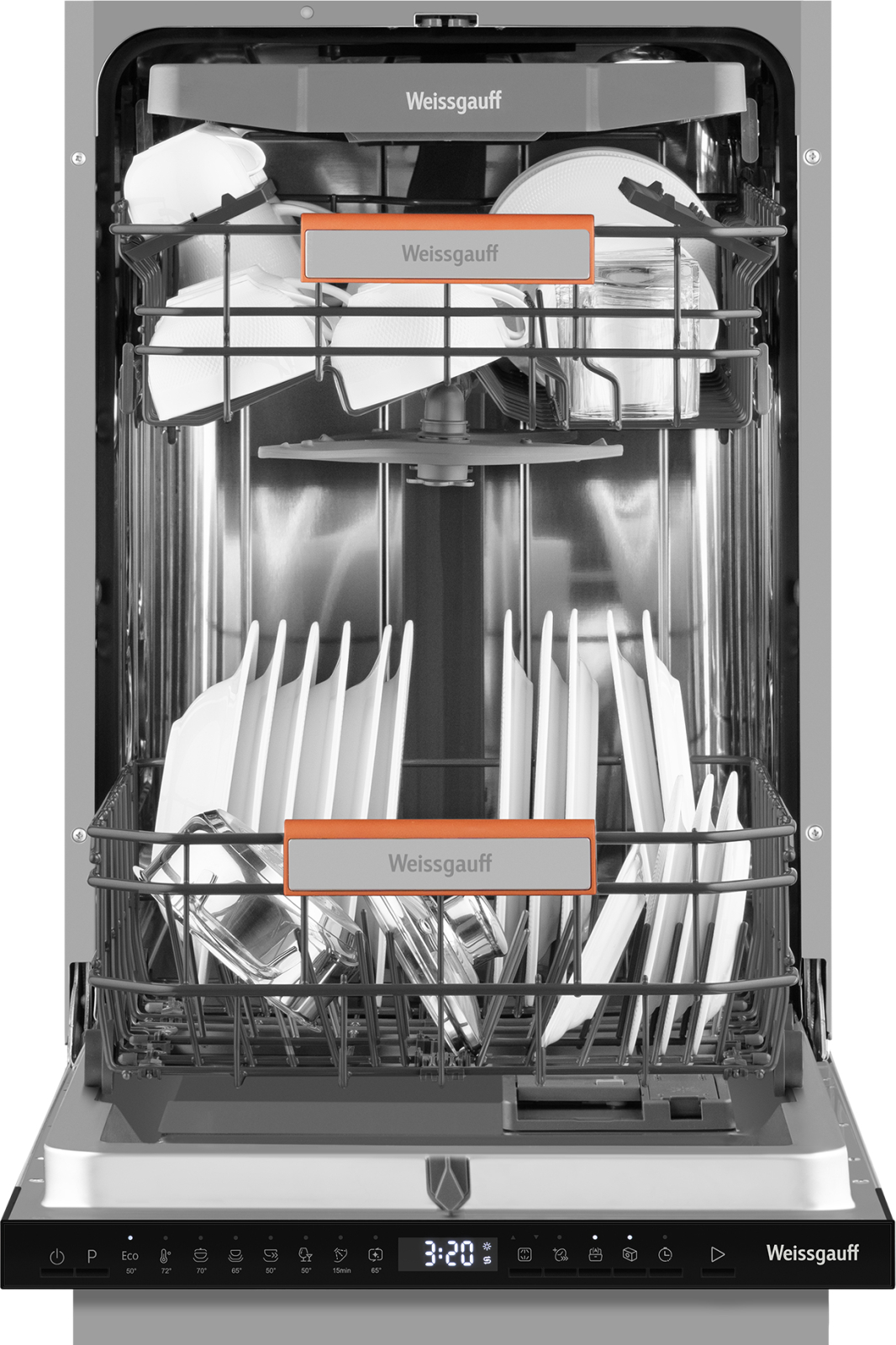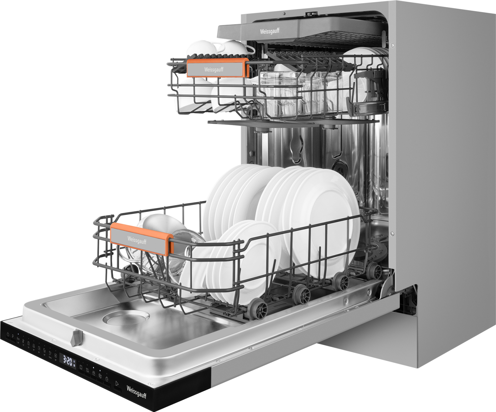 До 10 комплектов посуды одновременно вы можете расположить в данной посудомоечной машине, благодаря современным продуманным и эргономичным корзинам, которыми Weissgauff оснастили эту модель.