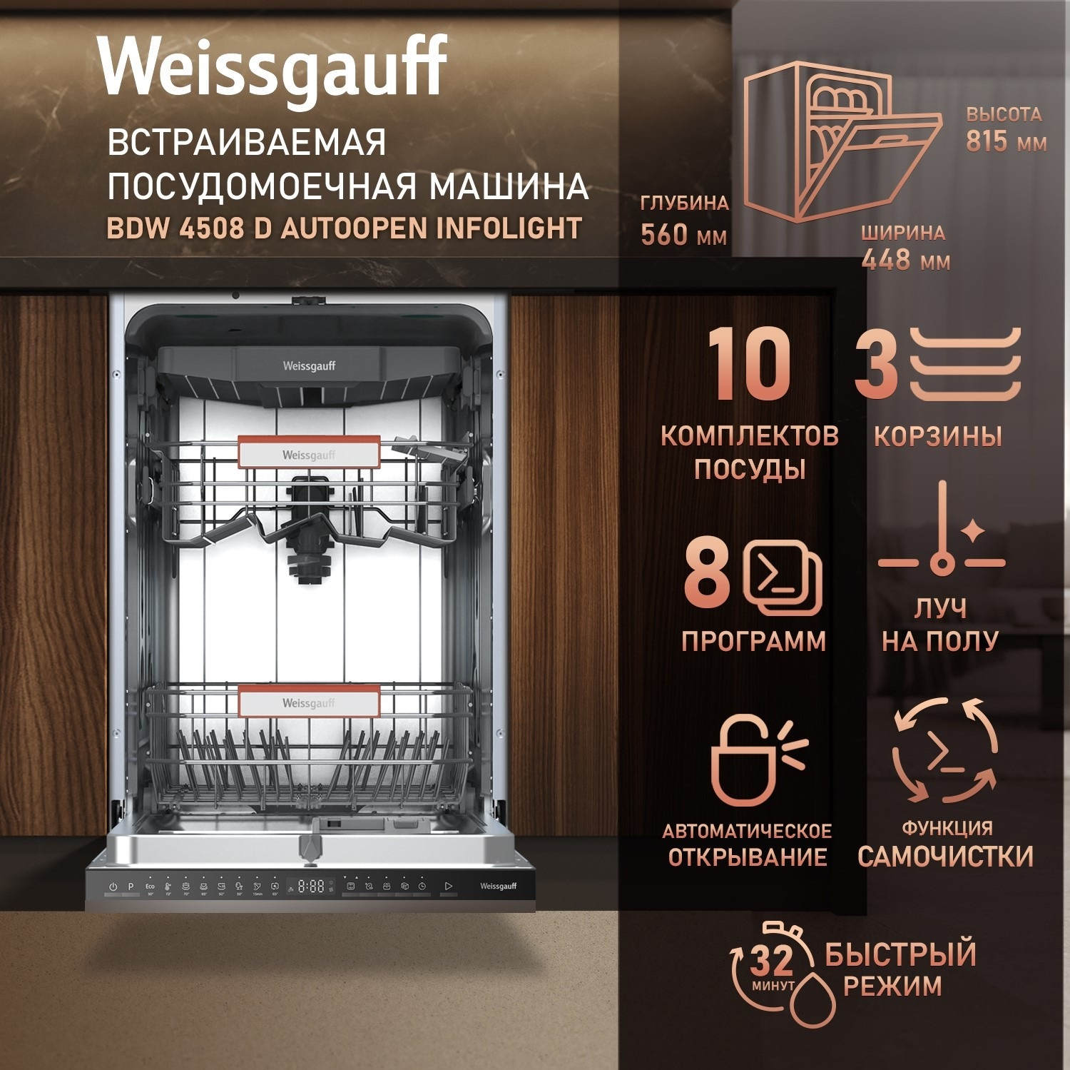 Узкая посудомоечная машина Weissgauff, оснащенная лучом на полу и функцией автоматического открытия дверцы, что делает данную модель не только эффективной но и по-настоящему удобной в работе, так же сэкономит место на вашей кухне и обеспечит идеальный результат, а наличие 8 программ позволит подобрать оптимальный режим в зависимости от количества посуды и степени загрязнения.