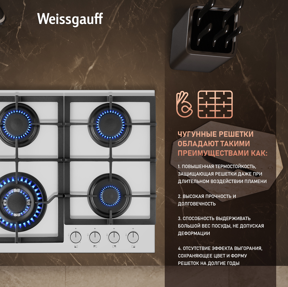 Решетки из высококачественного чугуна это неизменное качество, надежность и долговечность, воплощенные в каждой детали! Благодаря особому строению цельных решеток Weissgauff, размещение посуды на них становится ещё более удобным и устойчивым!