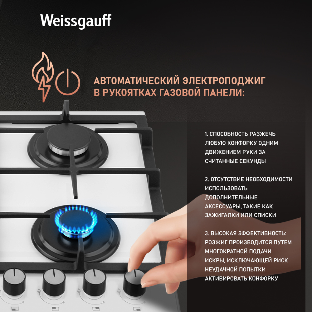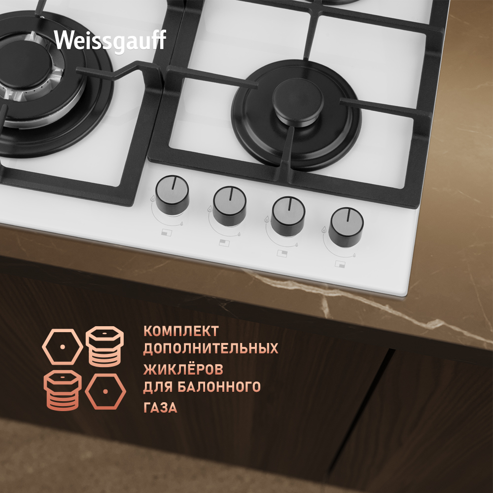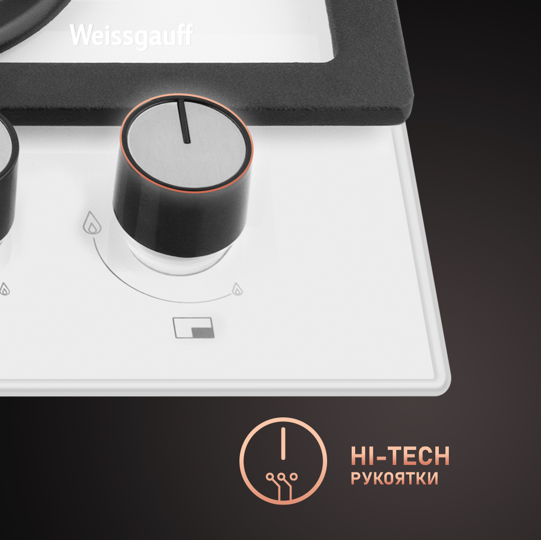 Варочная панель Weissgauff, оснащённая системой "Газ-контроль" и мощной WOK-конфоркой, создающей сразу 3 независимых контура пламени - это наиболее современная и функциональная модель Weissgauff, исполненная в белом закалённом стекле