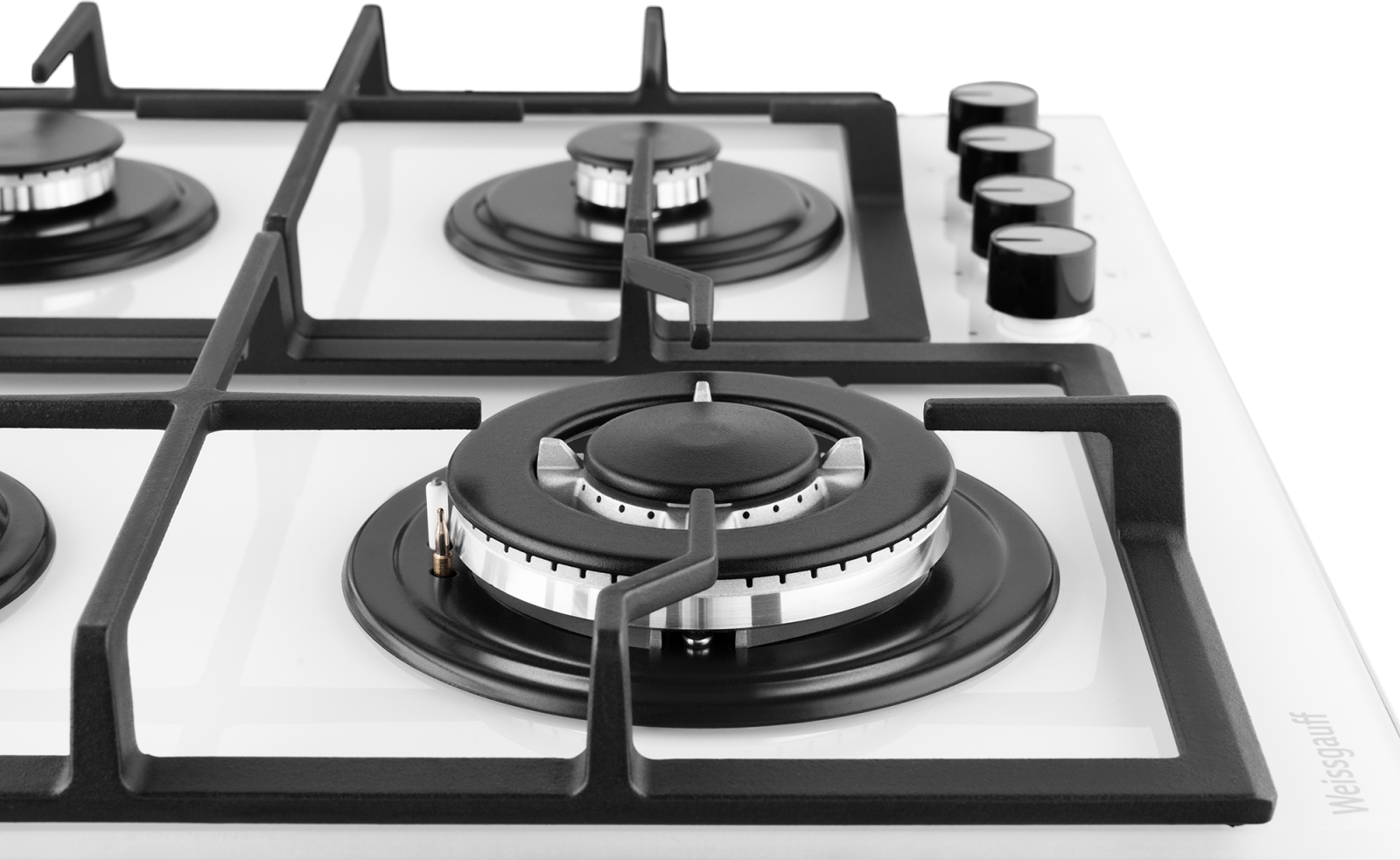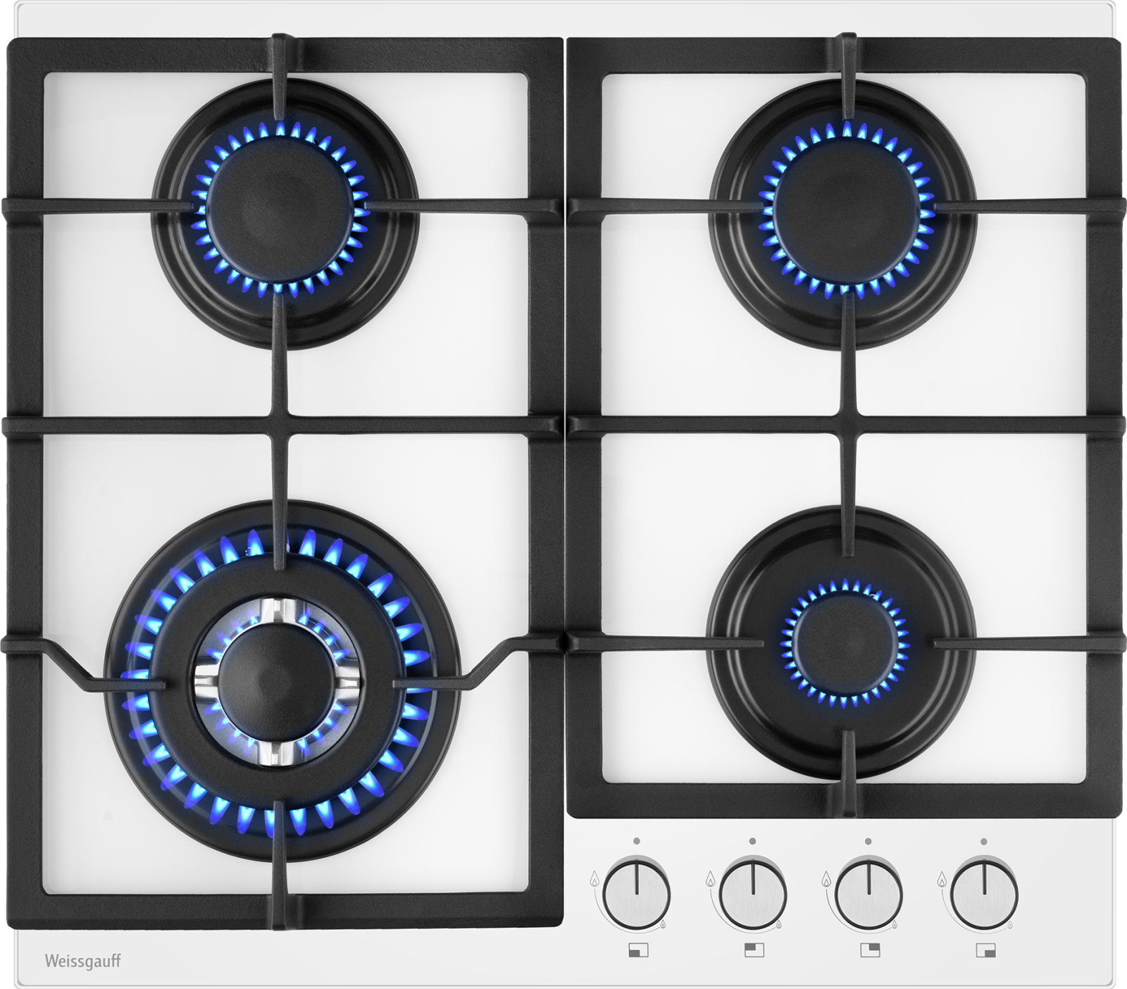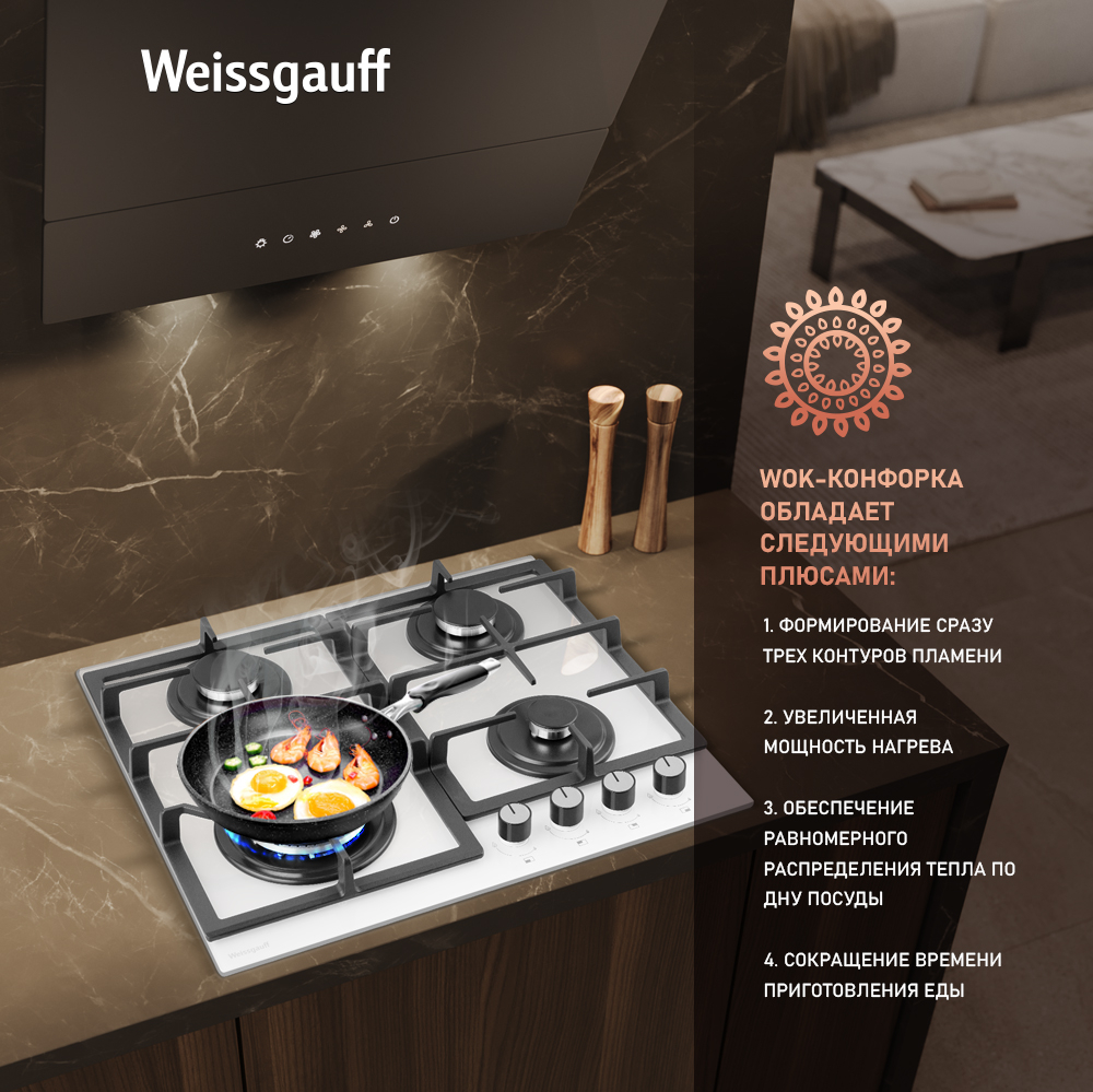 Варочная панель Weissgauff, оснащённая системой "Газ-контроль" и мощной WOK-конфоркой, создающей сразу 3 независимых контура пламени - это наиболее современная и функциональная модель Weissgauff, исполненная в белом закалённом стекле