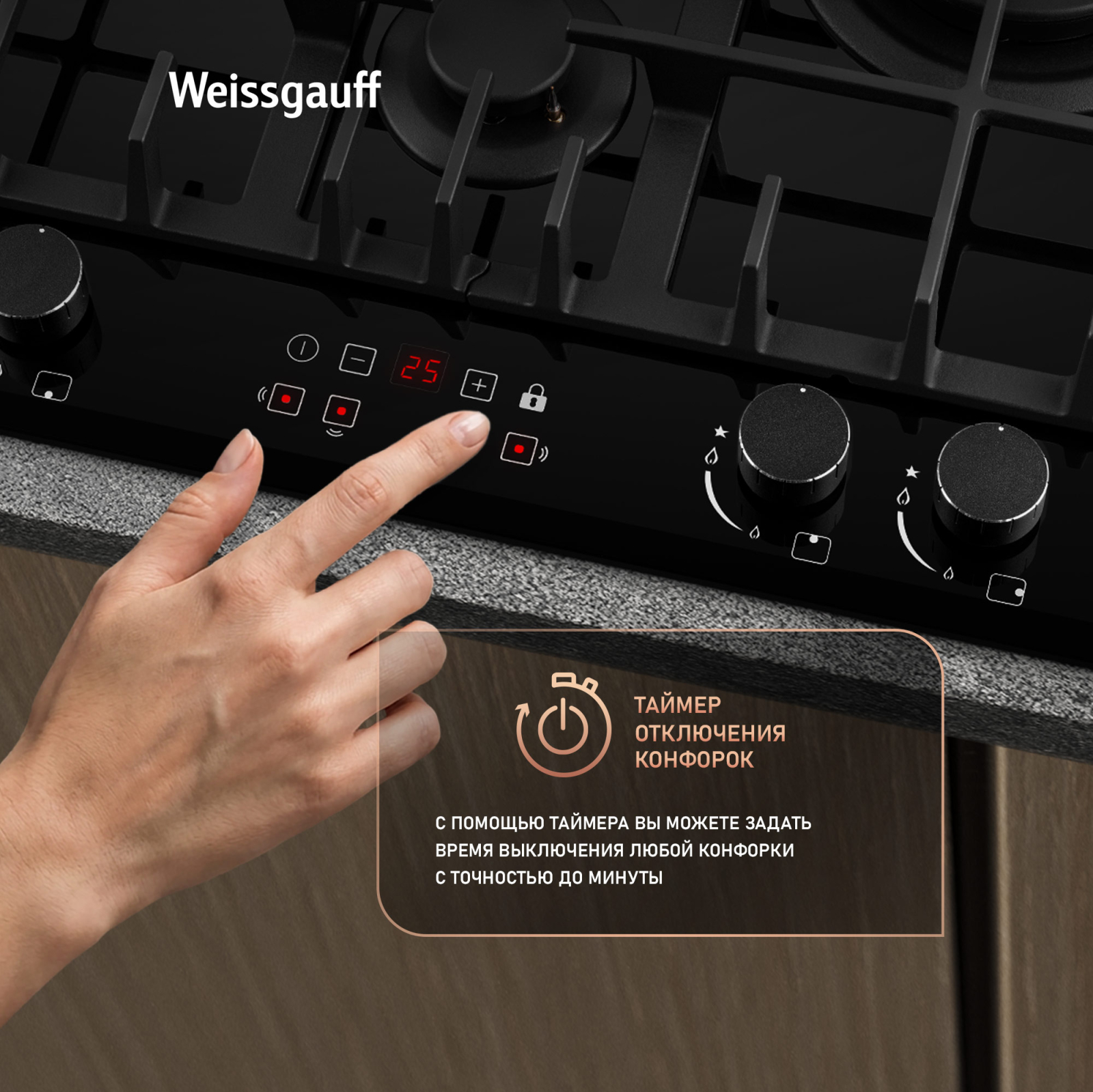Таймер до 99 минут дает вам возможность запрограммировать время выключения любой конфорки, с точностью до минуты.