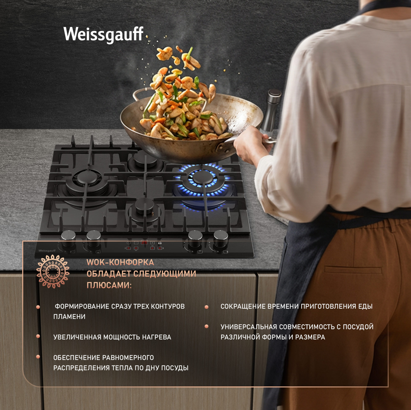 Две WOK-конфорки мощностью по 3,4 кВт, которые создают сразу три кольца пламени и позволяют осуществить нагрев даже самой крупногабаритной посуды в кратчайший срок!