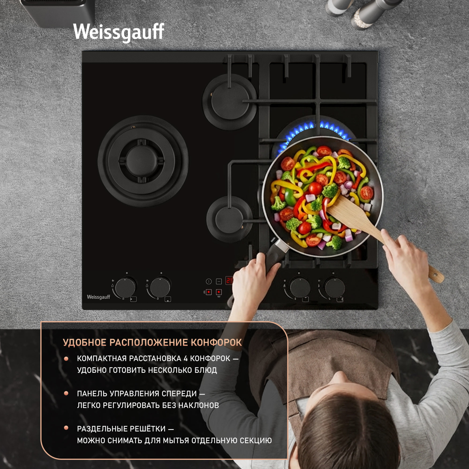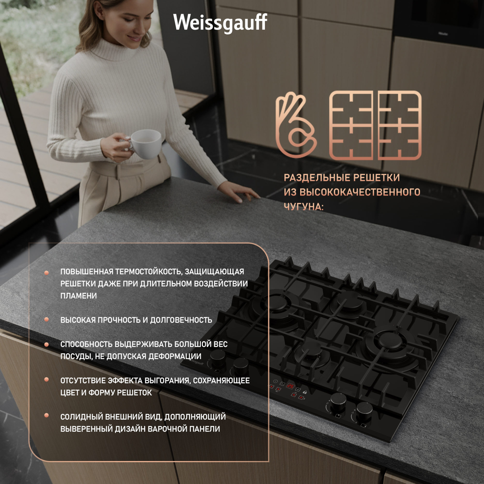 Решетки из высококачественного чугуна это неизменное качество, надежность и долговечность, воплощенные в каждой детали! Благодаря особому строению цельных решеток Weissgauff, размещение посуды на них становится ещё более удобным и устойчивым!
