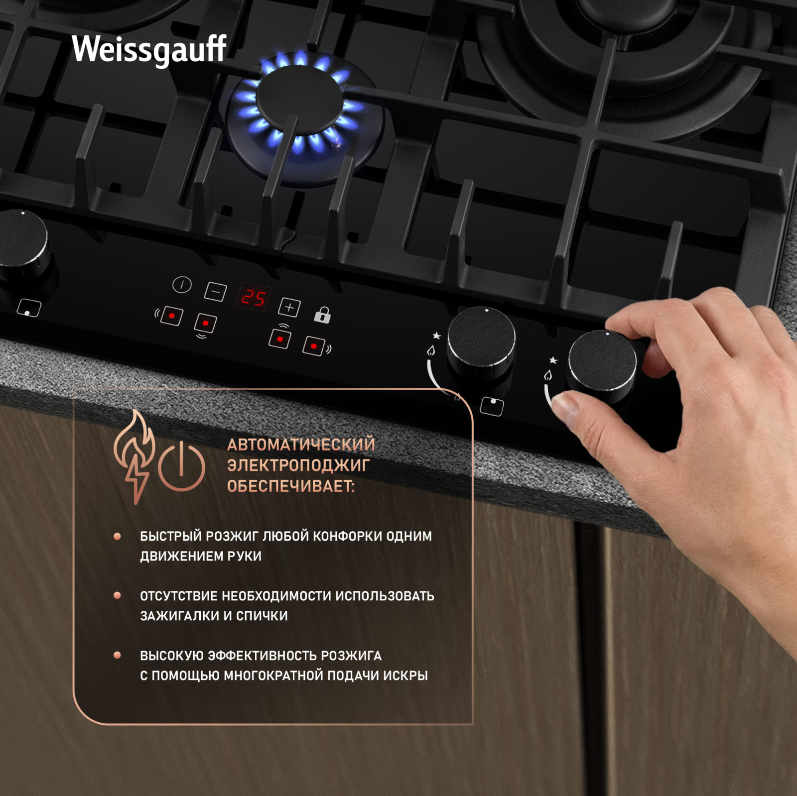 Автоматический электроподжиг, независимо встроенный в каждую из рукояток, позволит зажечь любую конфорку за долю секунды, всего одним нажатием и поворотом руки, не прибегая к дополнительным приспособлениям!