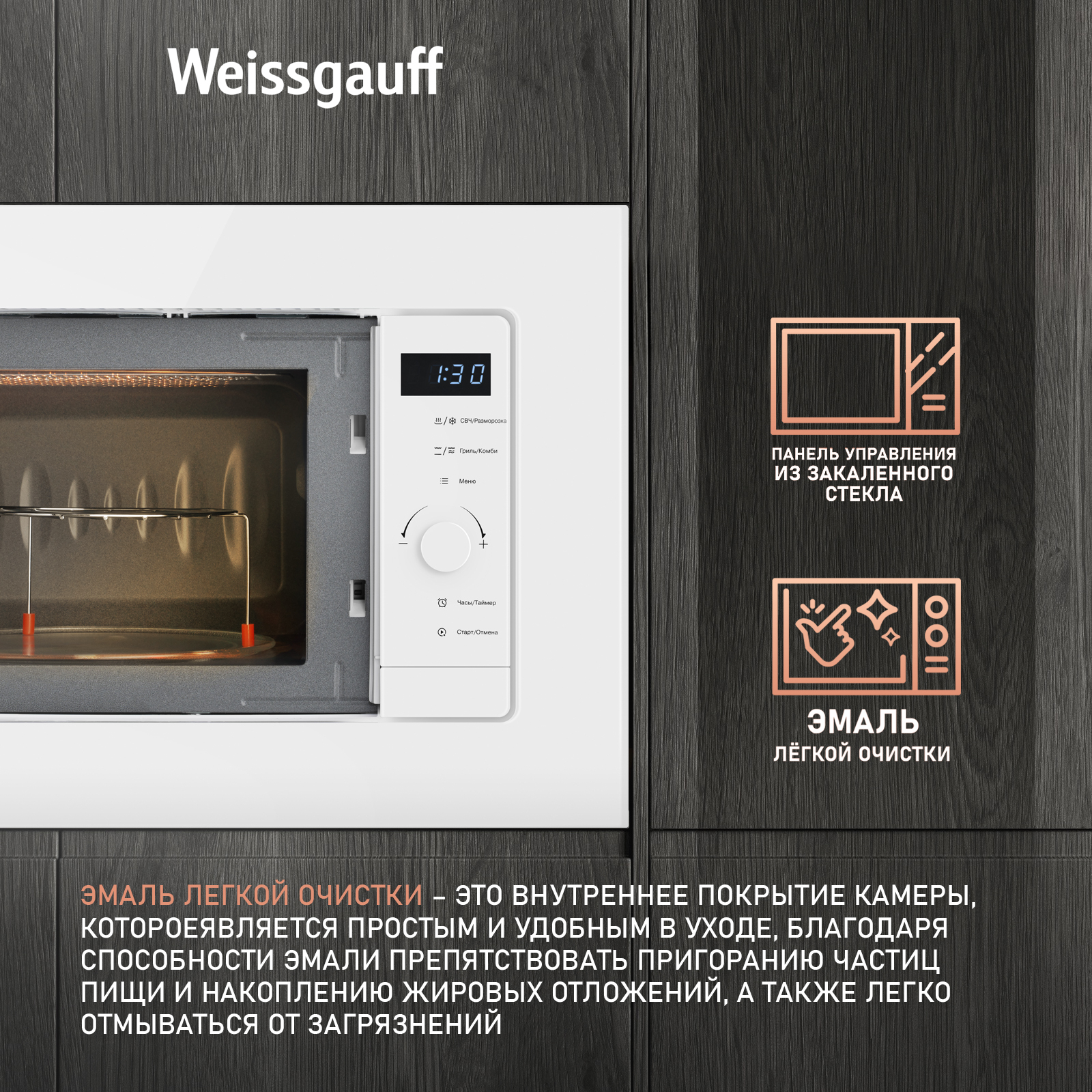 Дизайн, выполненный в закаленном стекле, станет финальным штрихом в совершенстве великолепного облика этой модели. Каждый раз, взаимодействуя с вашей микроволновой печью от Weissgauff, вы будете чувствовать, что это не только функциональное устройство, но и настоящее украшение вашей кухни!