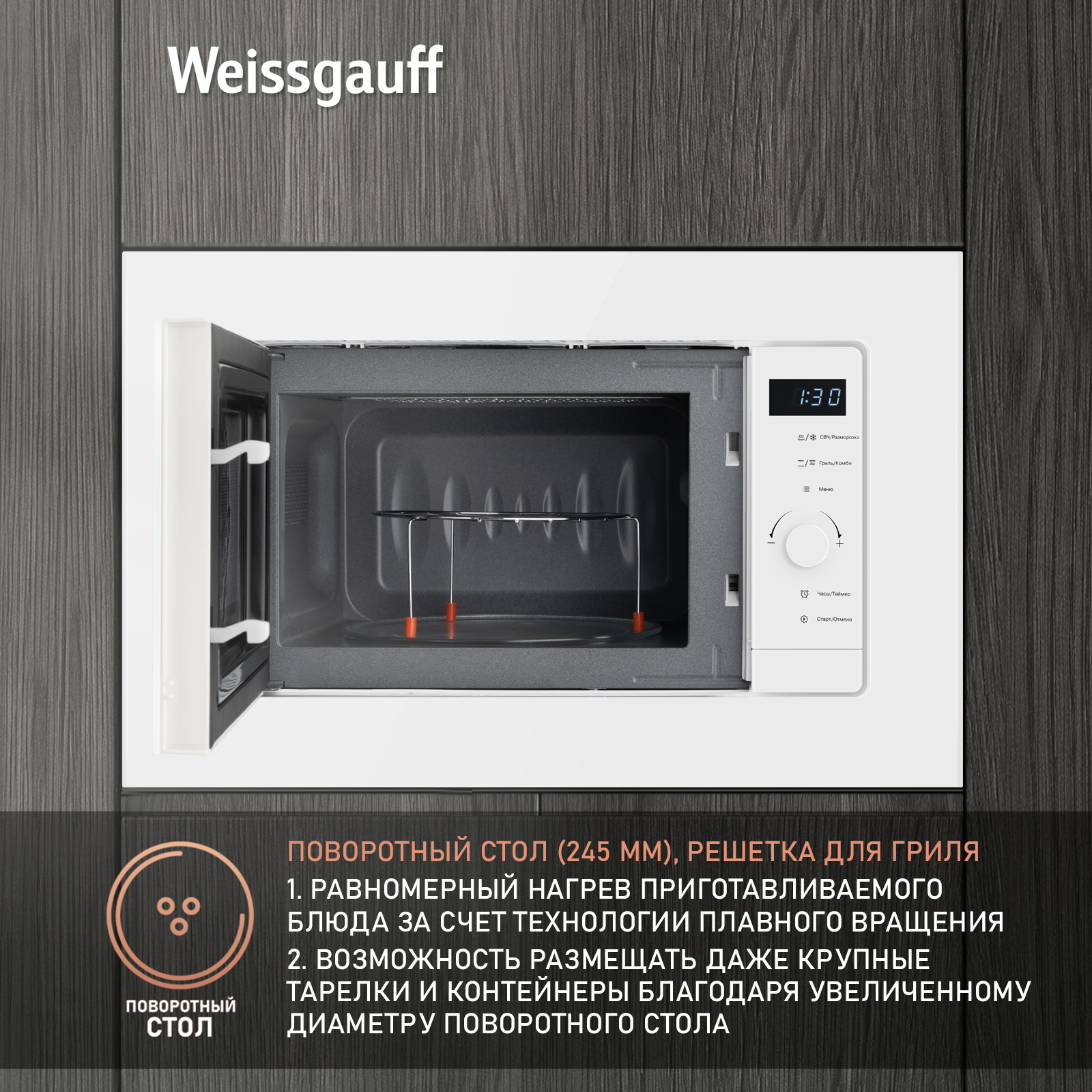Поворотный стол диаметром 245 мм не только обеспечивает равномерный прогрев блюда со всех сторон, но и удобно извлекается из камеры, делая легкими его очистку и уход