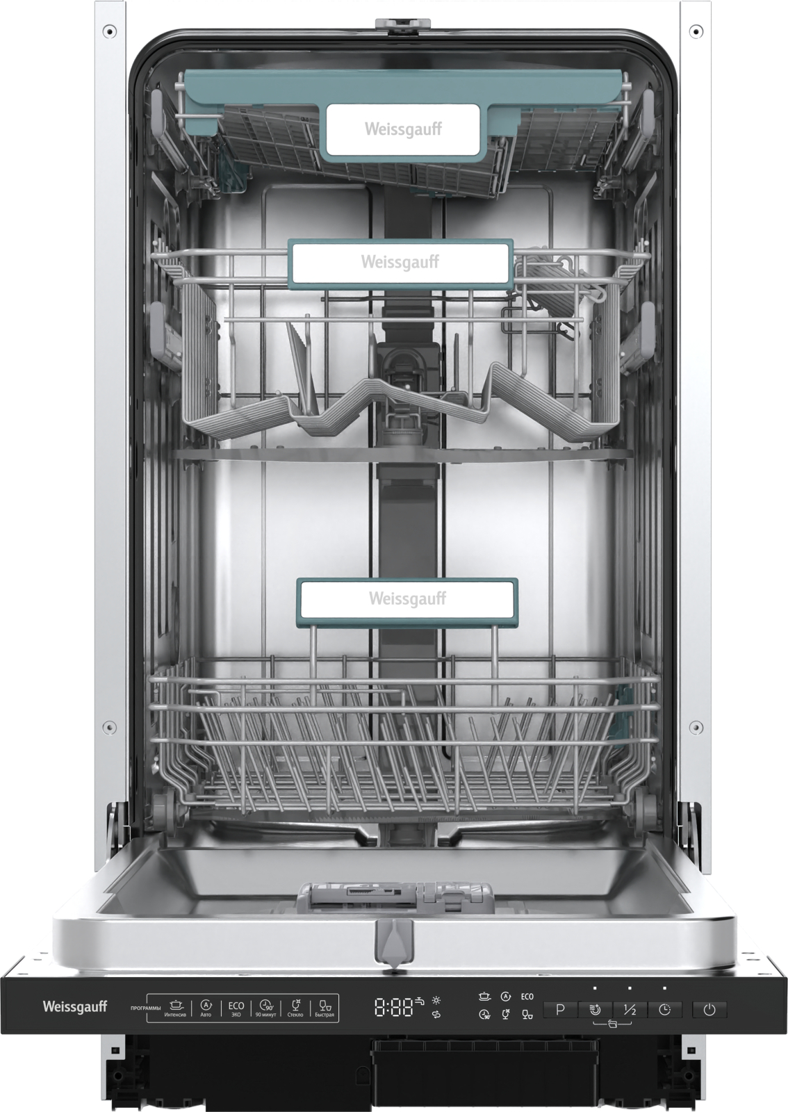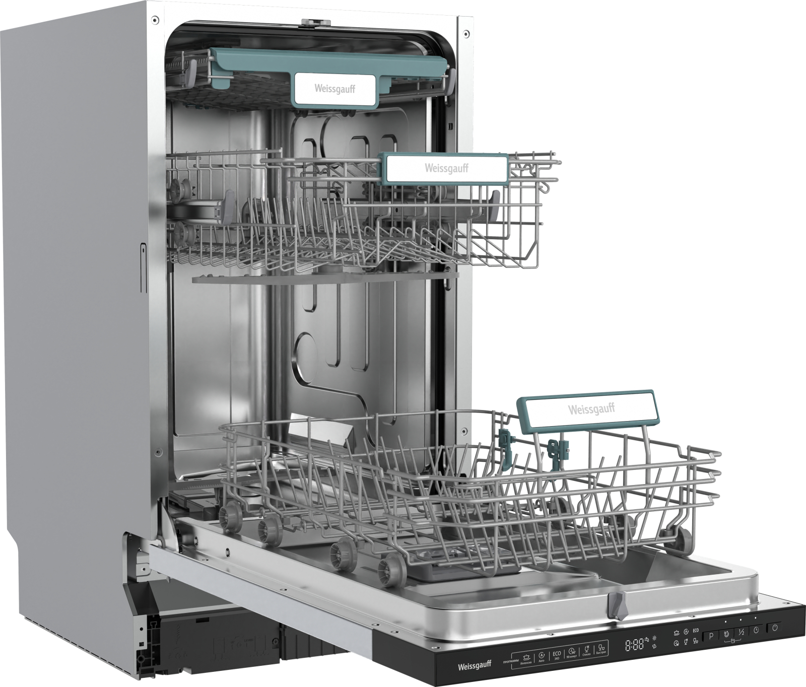 Корзины в дизайне "ECO LIFE" с легендарным узнаваемым оттенком зеленого цвета, отражают концепцию экологичности подходов Weissgauff к созданию бытовой техники! Забота о здоровье пользователя, безопасность используемых материалов и безукоризненно высокое качество мытья посуды - все это реализовано в данной модели посудомоечной машины!