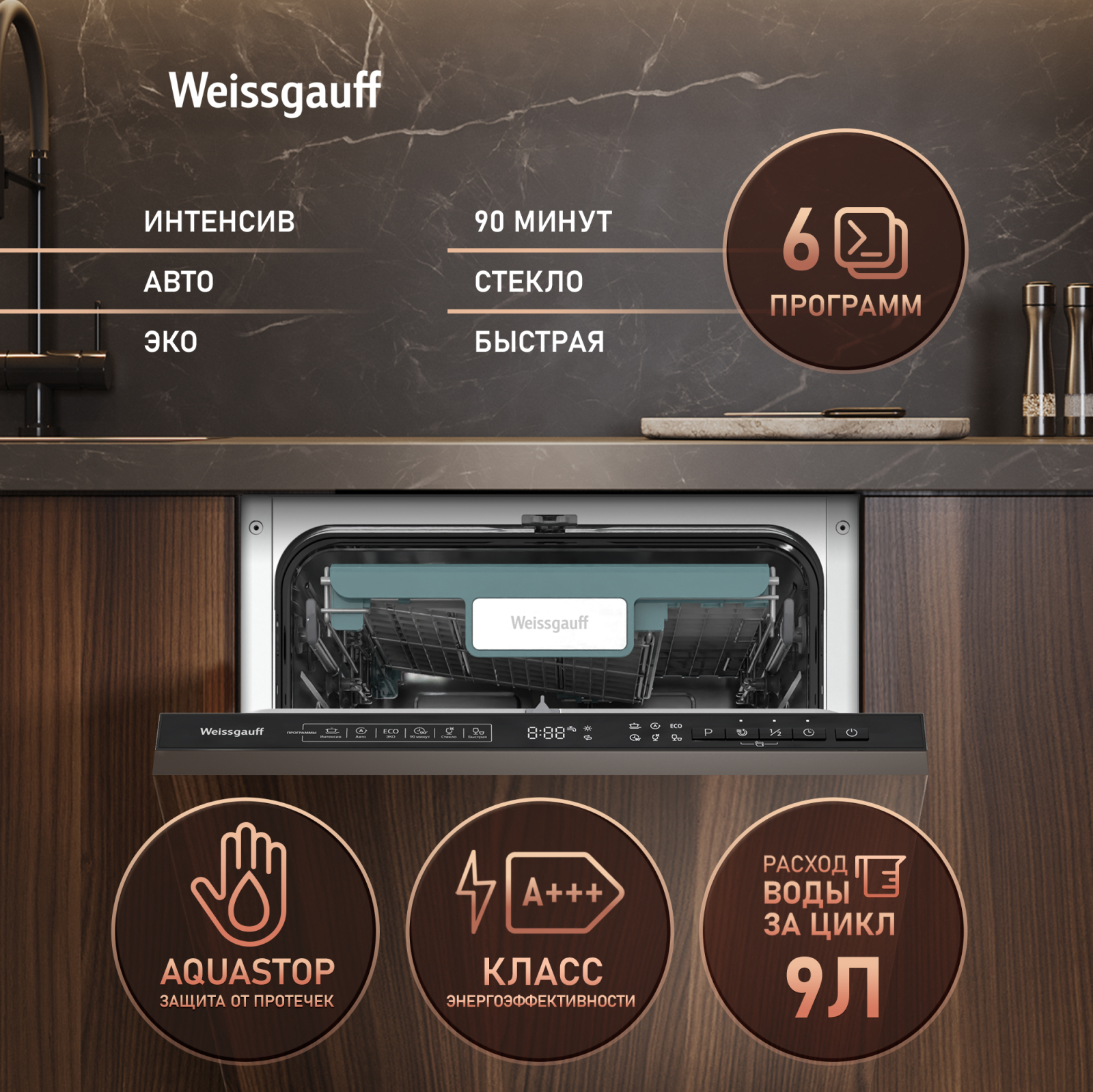 Узкая посудомоечная машина Weissgauff, оснащенная проекцией времени до окончания цикла работы на полу, инверторным двигателем и функцией автоматического открытия дверцы, что делает данную модель не только эффективной, но и по-настоящему удобной в работе не только сэкономит место на вашей кухне, но и обеспечит идеальный результат: 3 корзины позволят расположить посуду оптимальным образом для достижения наилучшего качества мытья, а наличие 6 программ позволит подобрать оптимальный режим в зависимости от количества посуды и степени загрязнения.