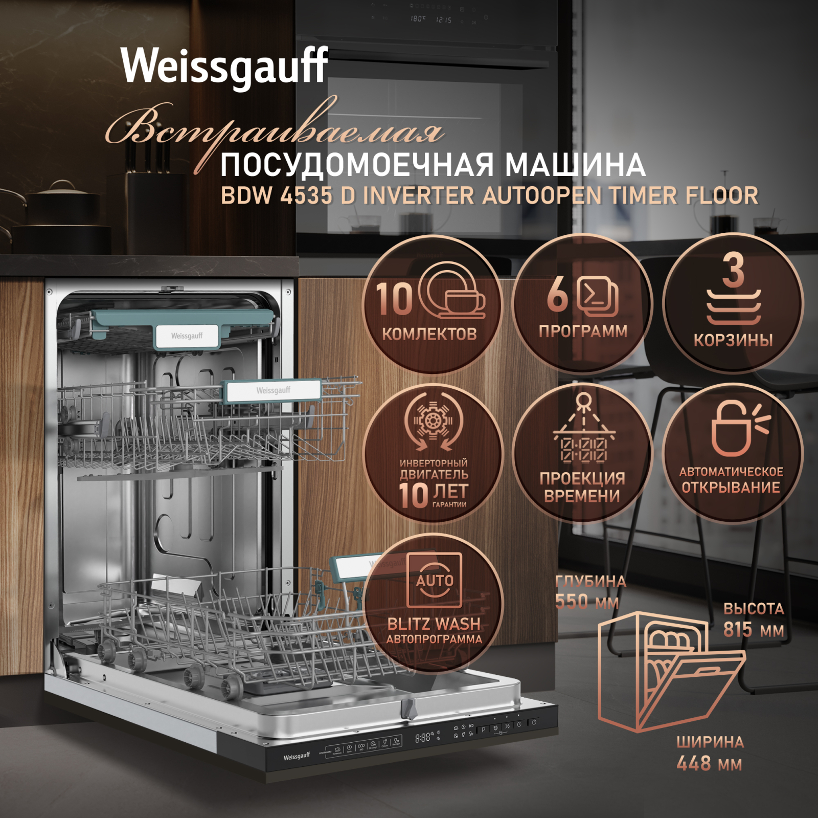 Встраиваемая посудомоечная машина с проекцией времени на полу, авто-открыванием и инвертором