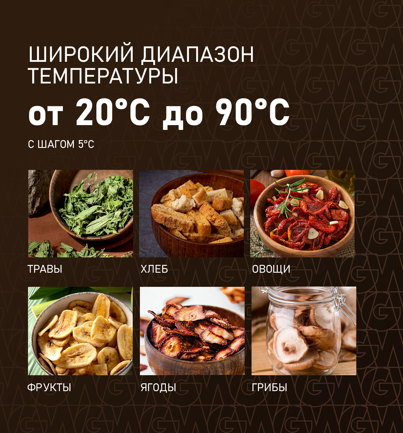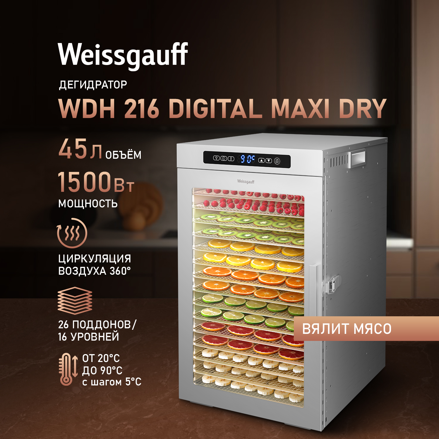 Дегидратор от Weissgauff - это инновационное решение для вашей кухни, открывающее новые горизонты в процессе обезвоживания продуктов растительного и животного происхождения. С его помощью вы сможете создавать разнообразные продукты: овощные и фруктовые чипсы, хлебцы, пастилу, а также сушёное и вяленое мясо и рыбу. Современный и стильный дизайн устройства станет украшением любой кухни. Его компактные размеры, объём 45 литров и мощность 1500 Вт позволяют разместить его в любом уголке кухни.