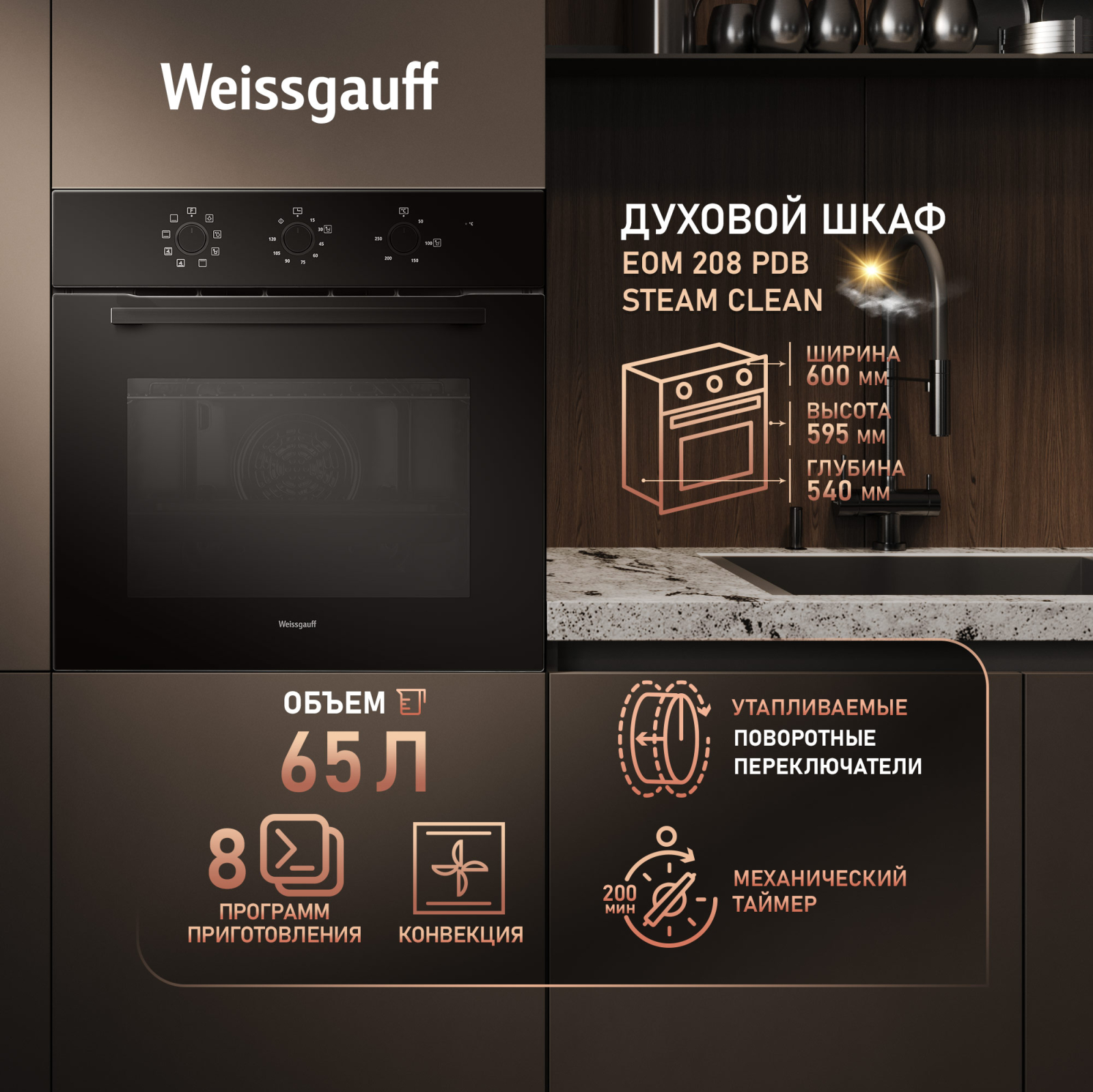 Дизайн в черном цвете - станет финальным штрихом в совершенстве облика этой модели. Каждый раз, взаимодействуя с духовым шкафом от Weissgauff, вы будете в полной мере ощущать, как он способен нагревать не только еду, но и согревать душу, став настоящим сердцем вашего уютного домашнего очага