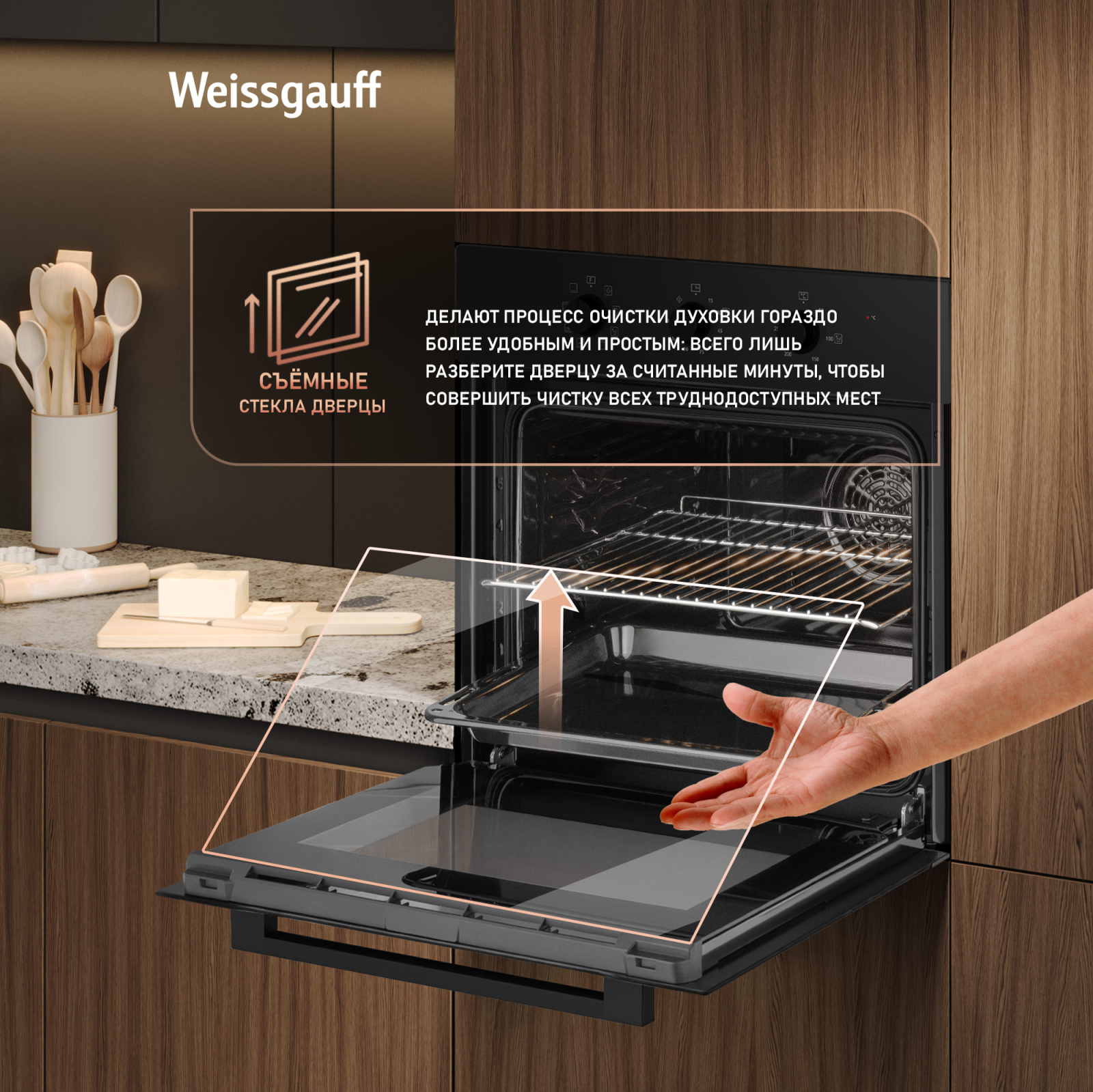 Двойное стекло дверцы, воплощающее в себе весь подход к безопасности и термозащите, который Weissgauff реализовали в данной модели. Теперь случайные прикосновения к дверце духового шкафа во время процесса приготовления еды больше будут не страшны, ведь мы позаботились о том, чтобы фронтальная сторона духового шкафа никогда не нагревалась до опасных температур.
