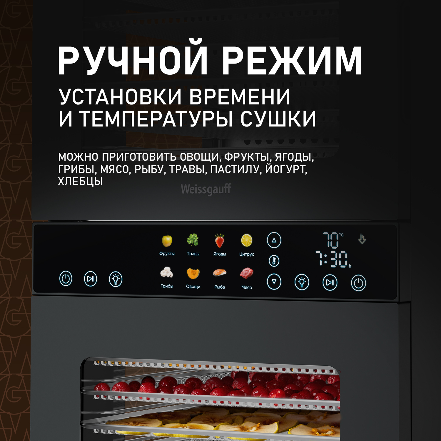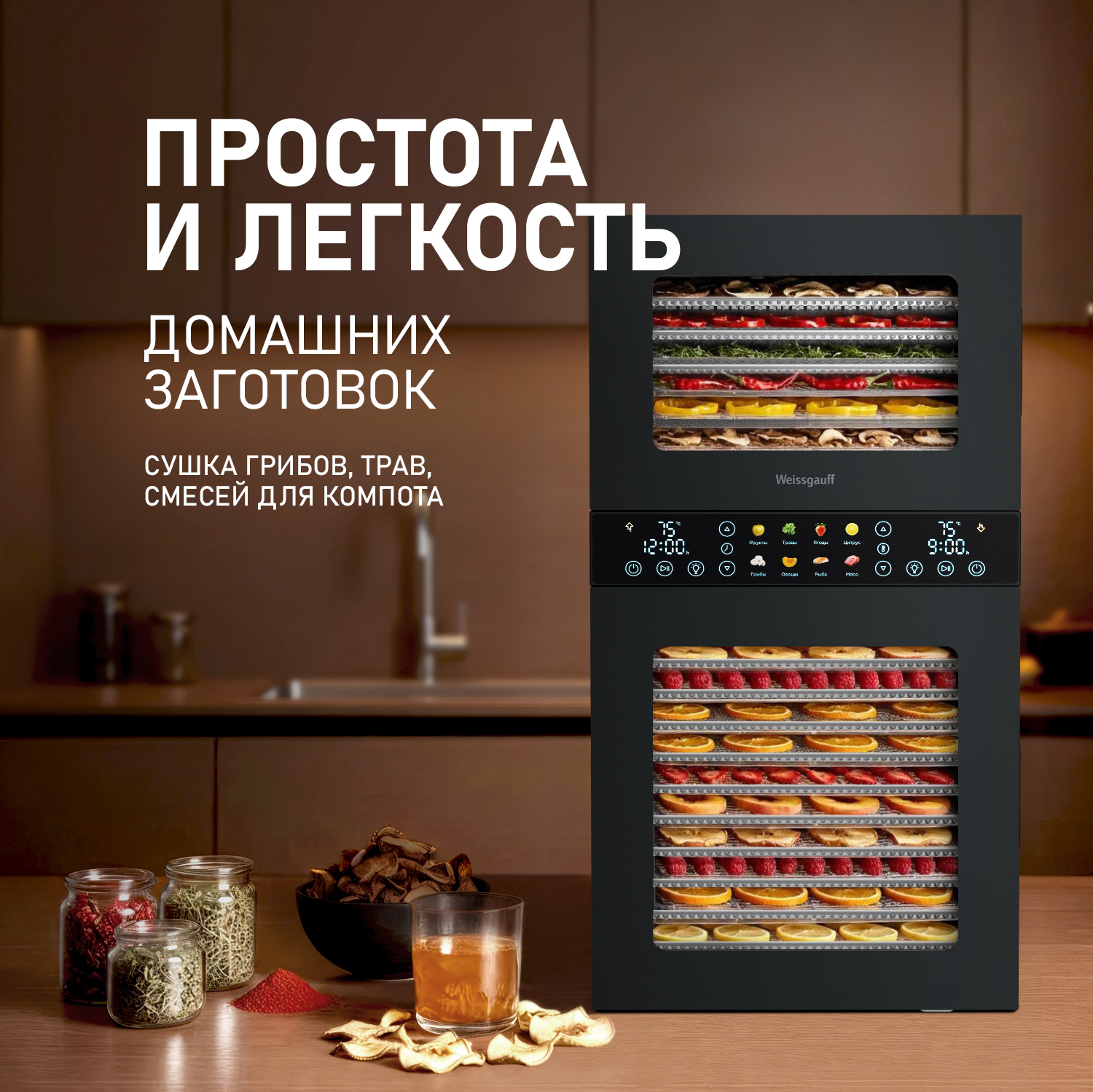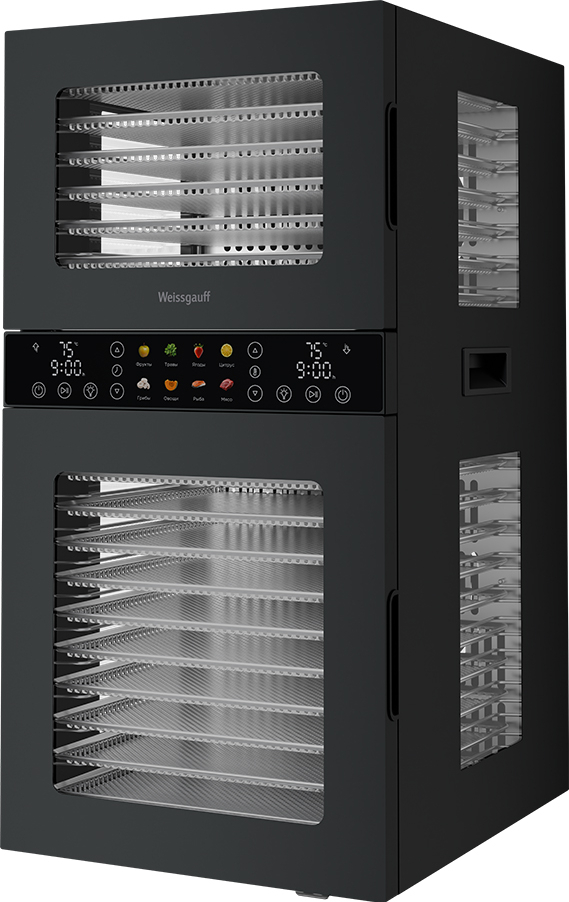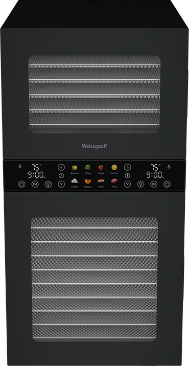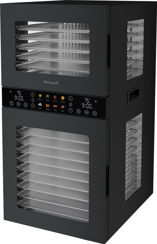 Дегидратор от Weissgauff - это инновационное решение для вашей кухни, открывающее новые горизонты в процессе обезвоживания продуктов растительного и животного происхождения. С его помощью вы сможете создавать разнообразные продукты: овощные и фруктовые чипсы, хлебцы, пастилу, а также сушёное и вяленое мясо и рыбу. Современный и стильный дизайн устройства станет украшением любой кухни. Его компактные размеры, объём 45 литров и мощность 1500 Вт позволяют разместить его в любом уголке кухни.