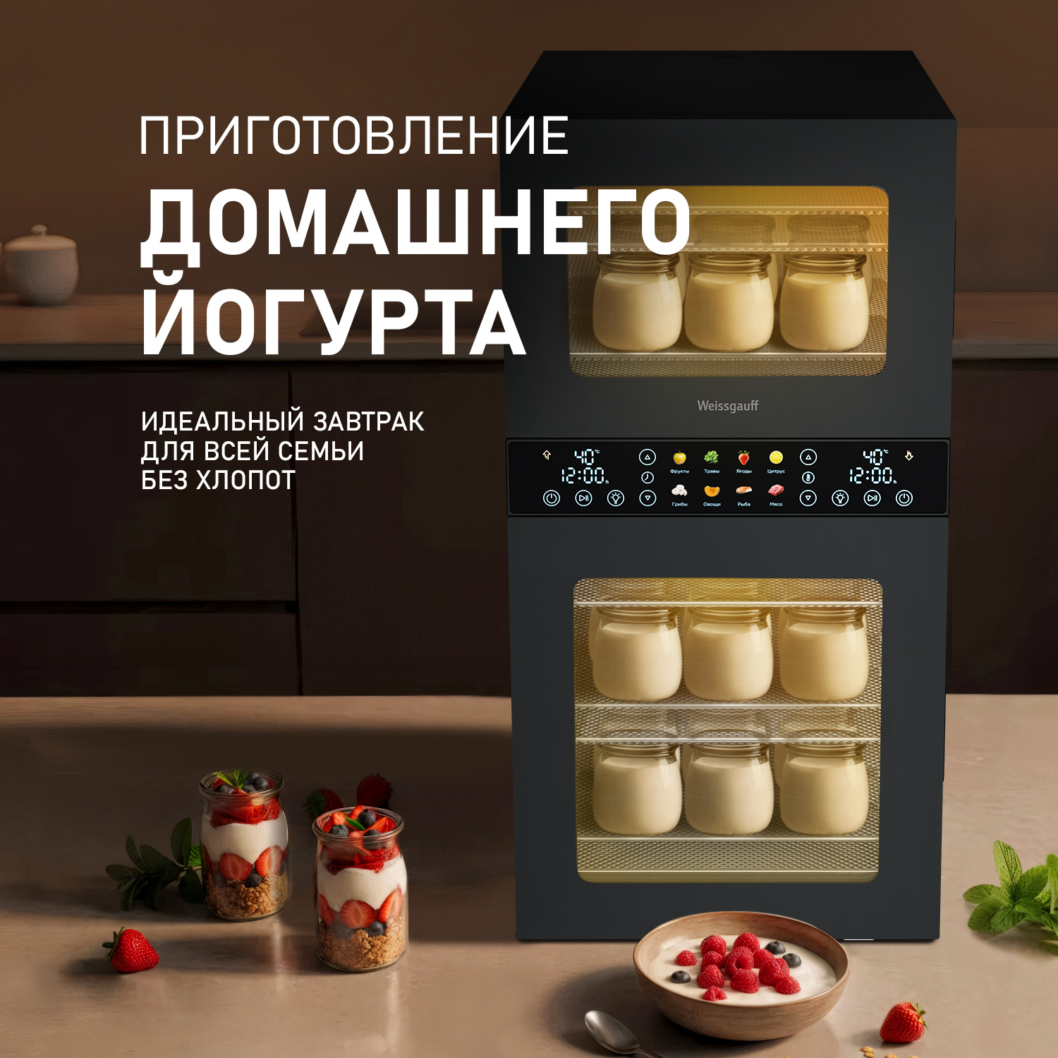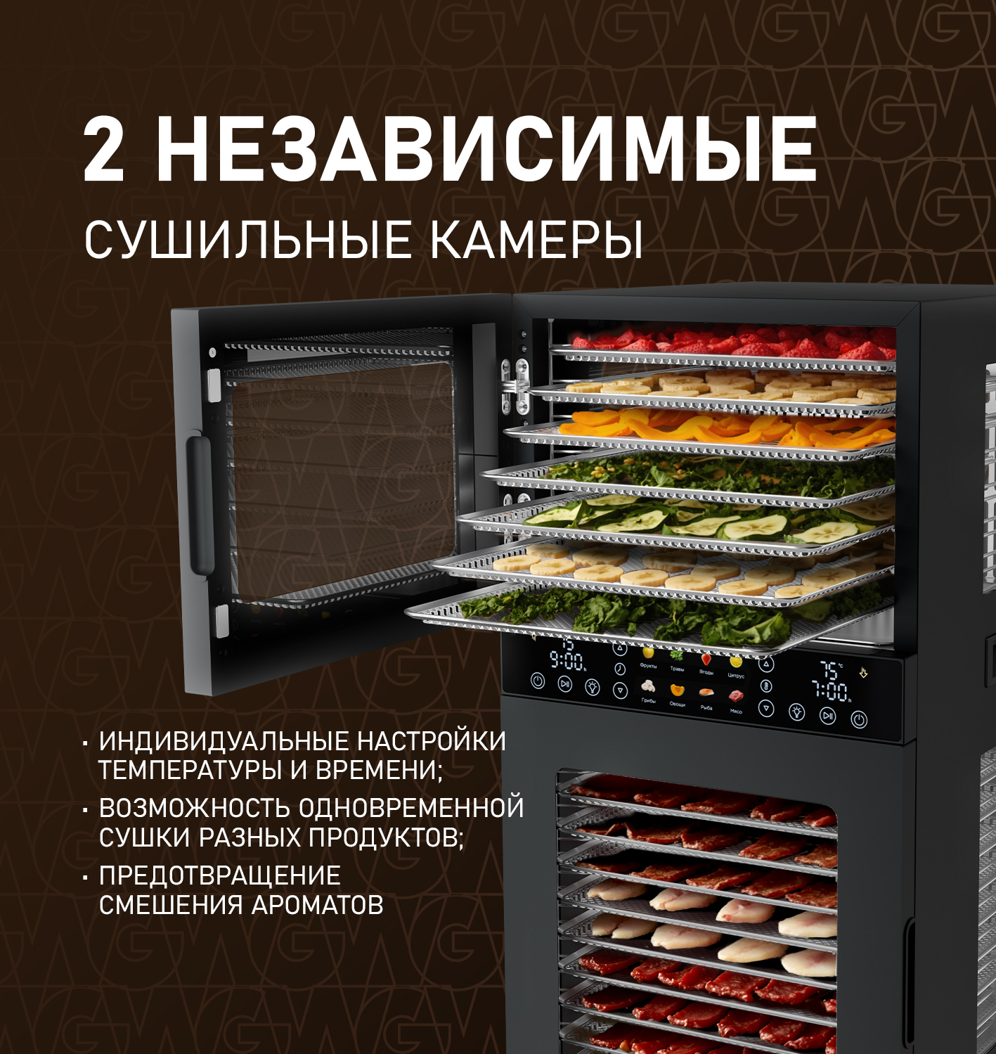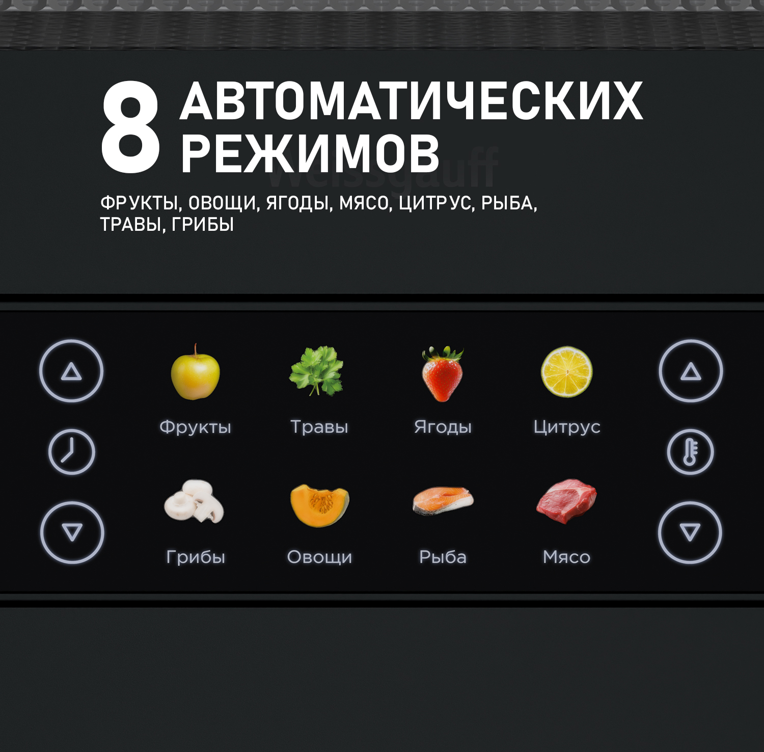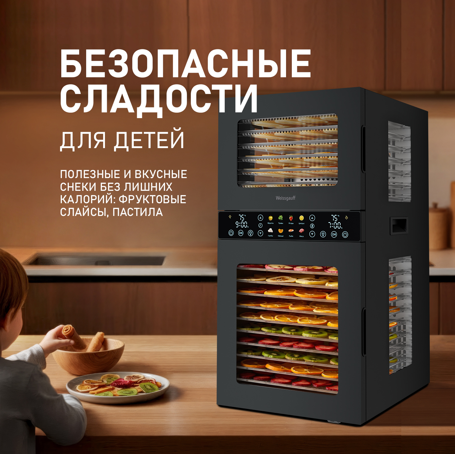 Дегидратор от Weissgauff - это инновационное решение для вашей кухни, открывающее новые горизонты в процессе обезвоживания продуктов растительного и животного происхождения. С его помощью вы сможете создавать разнообразные продукты: овощные и фруктовые чипсы, хлебцы, пастилу, а также сушёное и вяленое мясо и рыбу. Современный и стильный дизайн устройства станет украшением любой кухни. Его компактные размеры, объём 45 литров и мощность 1500 Вт позволяют разместить его в любом уголке кухни.