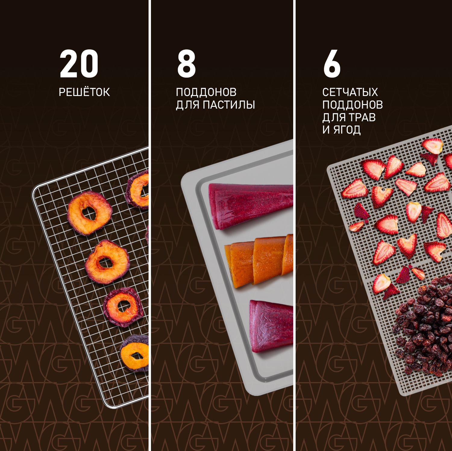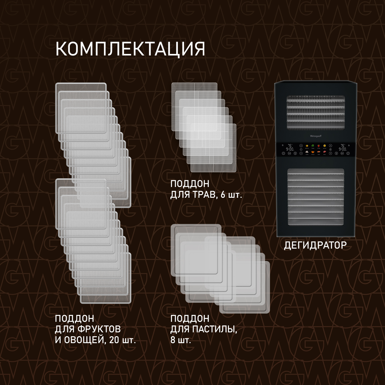 | Комплектация: | 20 решёток, 8 поддонов для пастилы, 6 сеток для трав. |