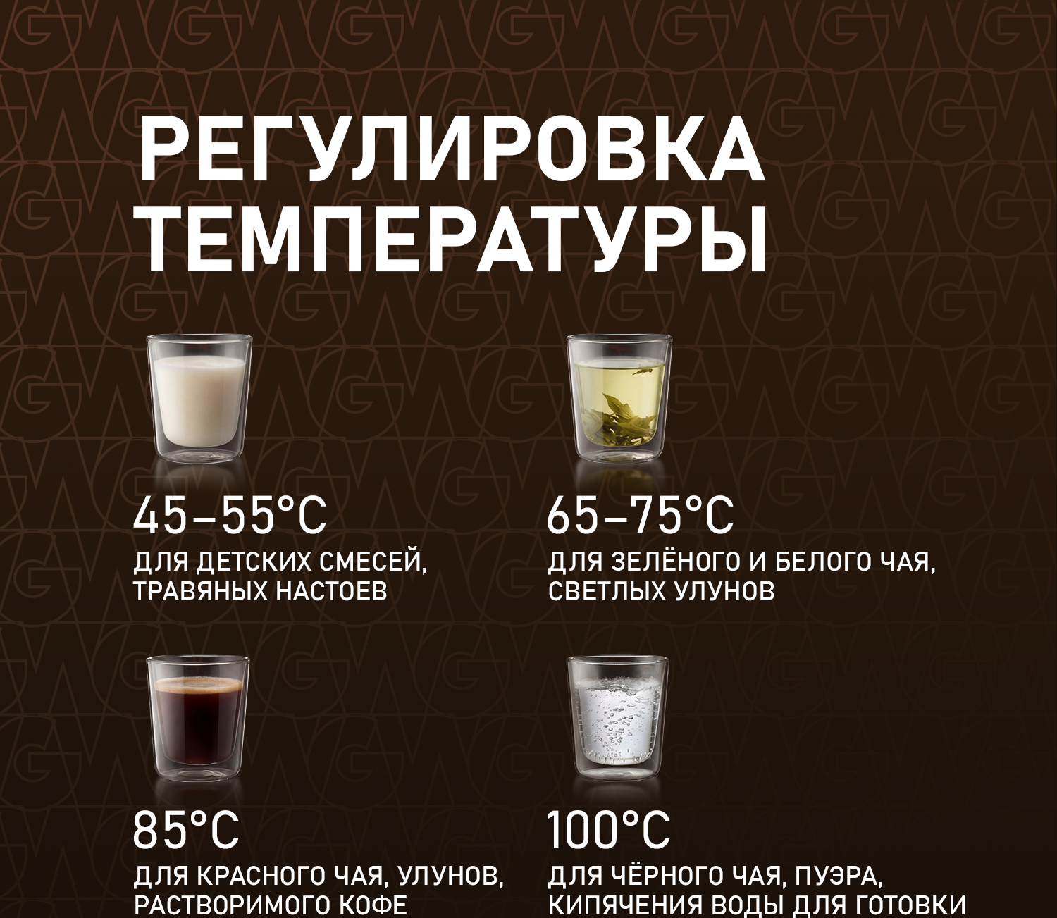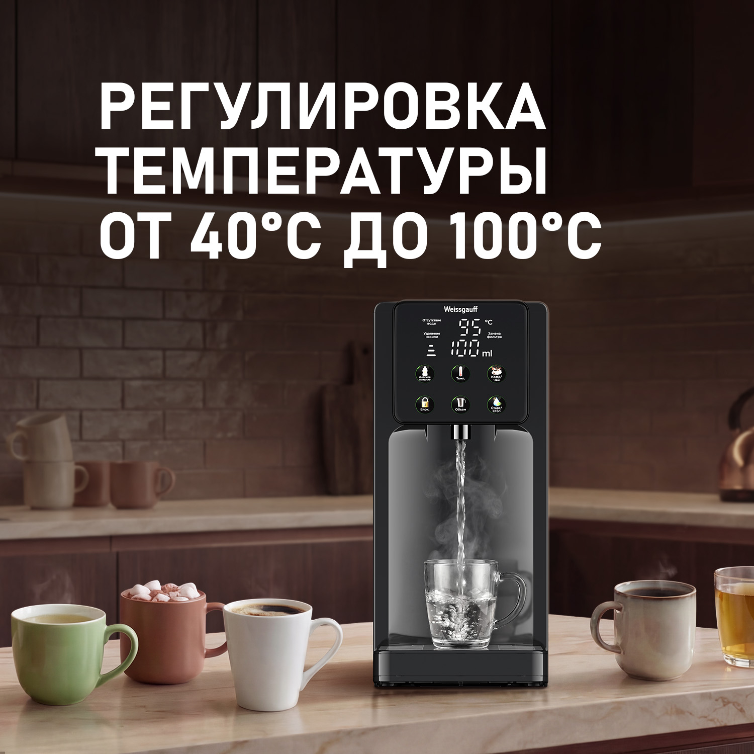 Диапазон температур от 40 до 100 °C, с возможностью выбора одного из 7 предустановленных уровней нагрева, позволит с легкостью обеспечить требуемую температуру подаваемой воды, исходя из предпочтений и пожеланий пользователя!