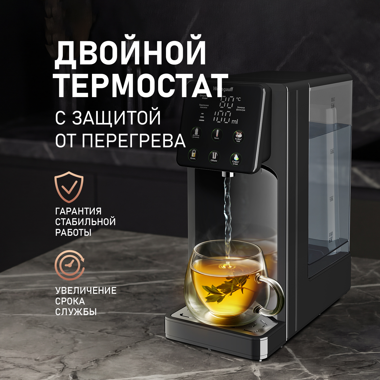Быстрая функция "Кофе/Чай" - позволит подать воду, нагретую до температуры 90 °C, что идеально подойдет для приготовления ароматного горячего кофе или душистого свежезаваренного чая!