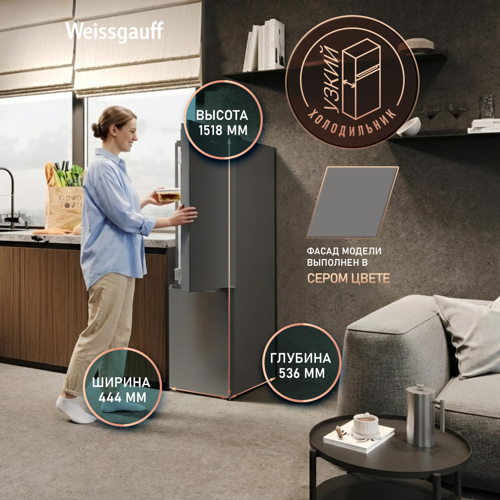 Отдельностоящий холодильник Weissgauff выполненный в сером цвете, обладающий компактными размерами и фантастической вместительностью - это соотношение превосходной эргономики внутреннего пространства, технологического совершенства и великолепия внешнего дизайна!