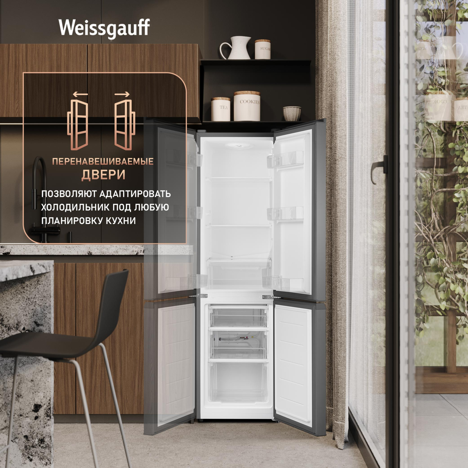 Перенавешиваемые двери позволят вам самостоятельно выбрать, в какую сторону будет осуществляться открывание холодильника, что особенно важно при планировании его размещения на кухне!