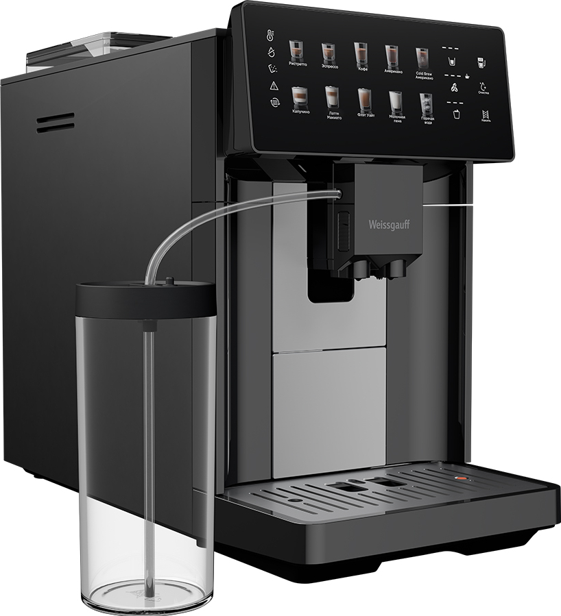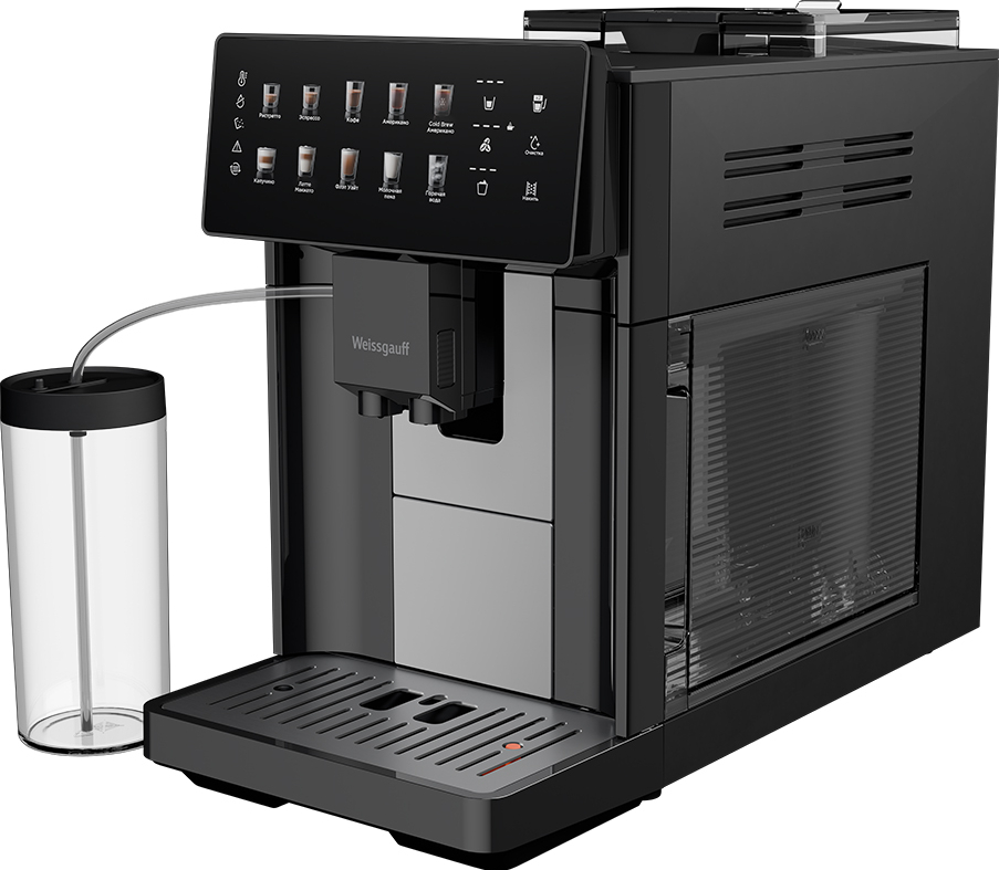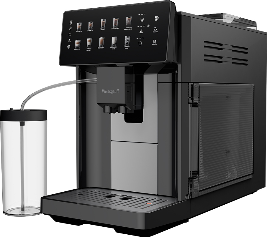 Кофемашина от Weissgauff, выполненная в черном цвете, оснащенная вместительным контейнером для зерен на 250 грамм, обладающая цветным сенсорным дисплеем, системой подачи молока с автоматическим капучинатором, внешней емкостью для молока, а также 10 заранее предустановленными программами для приготовления ароматного вкуснейшего кофе прямо на вашей кухне!