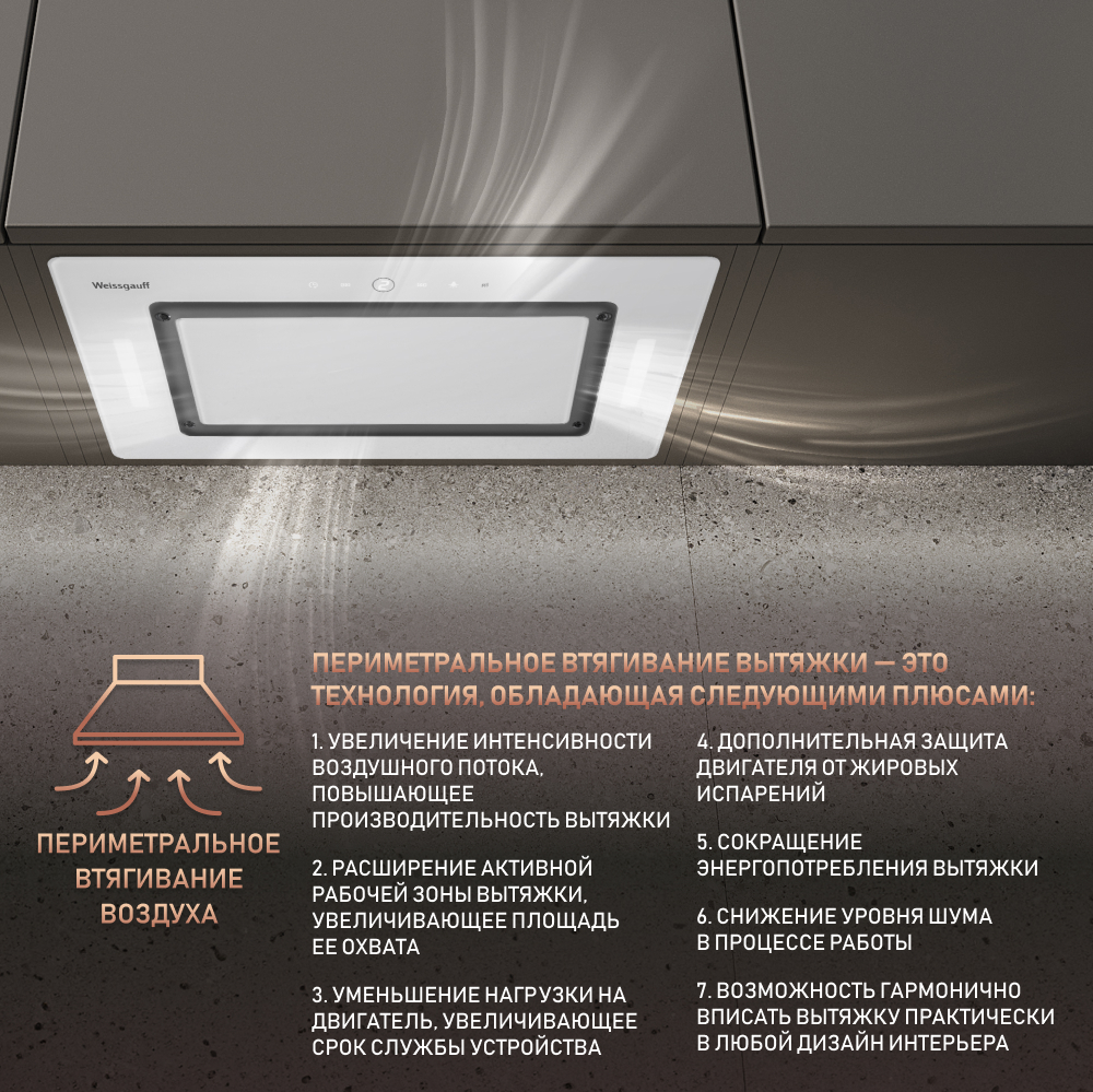 Периметральное всасывание - это технология, которая позволяет вытяжке достигать более высокой интенсивности поглощения воздуха при сохранении низкого уровня энергопотребления