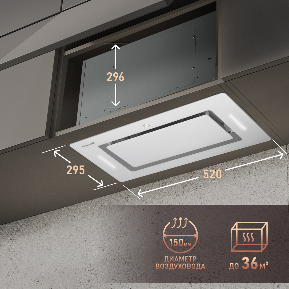 Эффективная работа в помещении площадью до 36 м2 - это гарантия того, что после установки вытяжки Weissgauff, обновление воздуха будет соответствовать всем требуемым нормам, сохраняя ваше здоровье на долгие годы!
