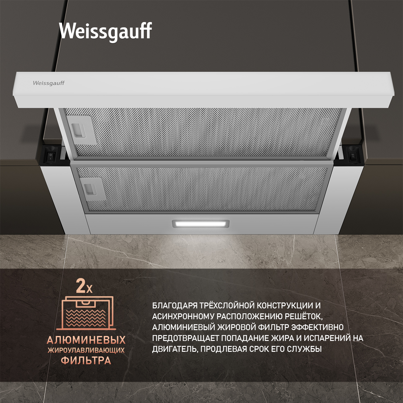 Алюминиевый жировой фильтр особой трёхслойной конструкции, с асинхронным расположением решёток, эффективно защитит двигатель от жира и испарений, продлив срок службы устройства.