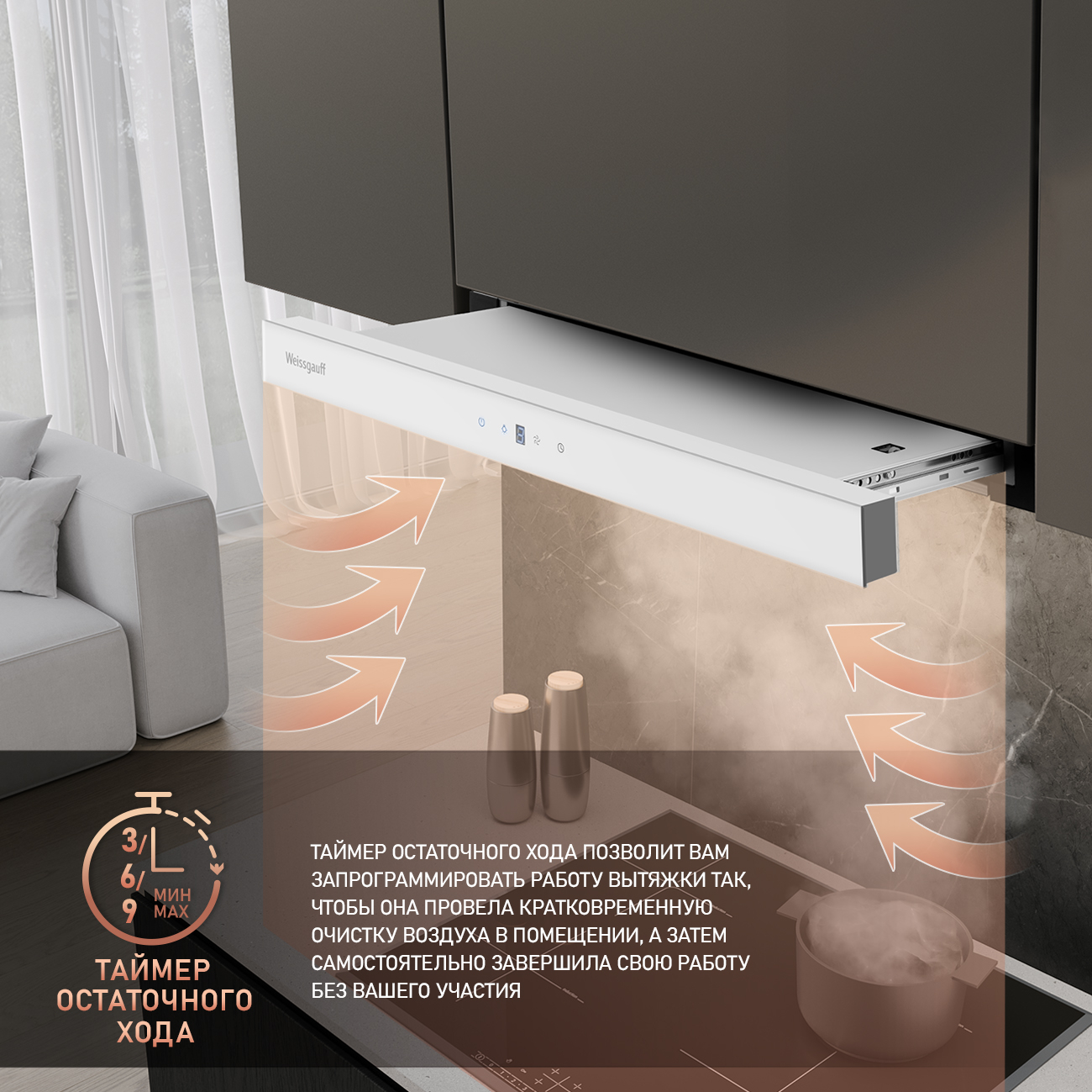 Эффективная работа в помещении площадью до 16 м2 - это гарантия того, что после установки вытяжки Weissgauff, обновление воздуха будет соответствовать всем требуемым нормам, сохраняя ваше здоровье на долгие годы!