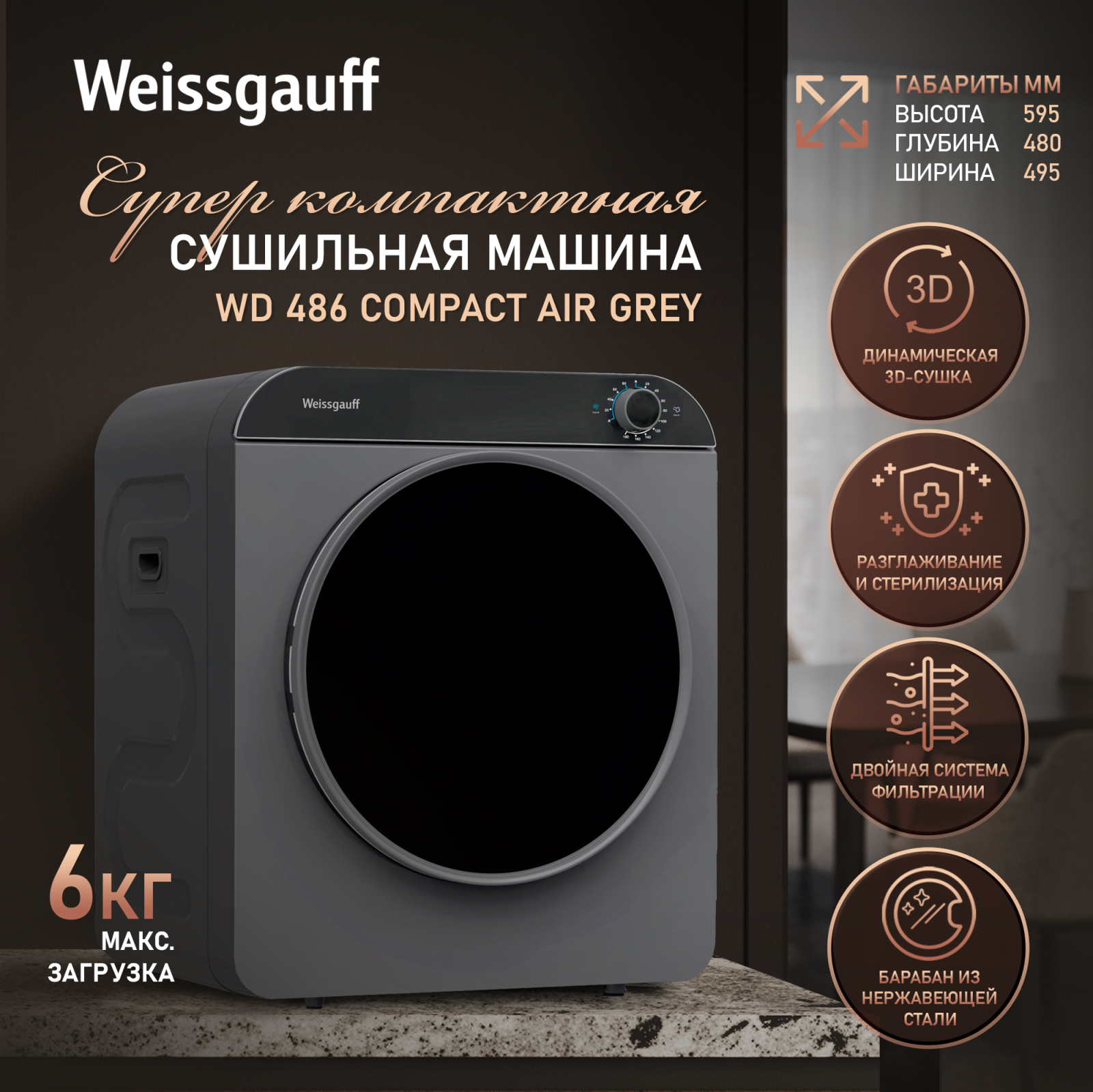 • Загрузка белья до 6 кг — в сочетании с вместительным барабаном это возможность отправить в сушильную машину сразу весь необходимый объем белья за один раз!