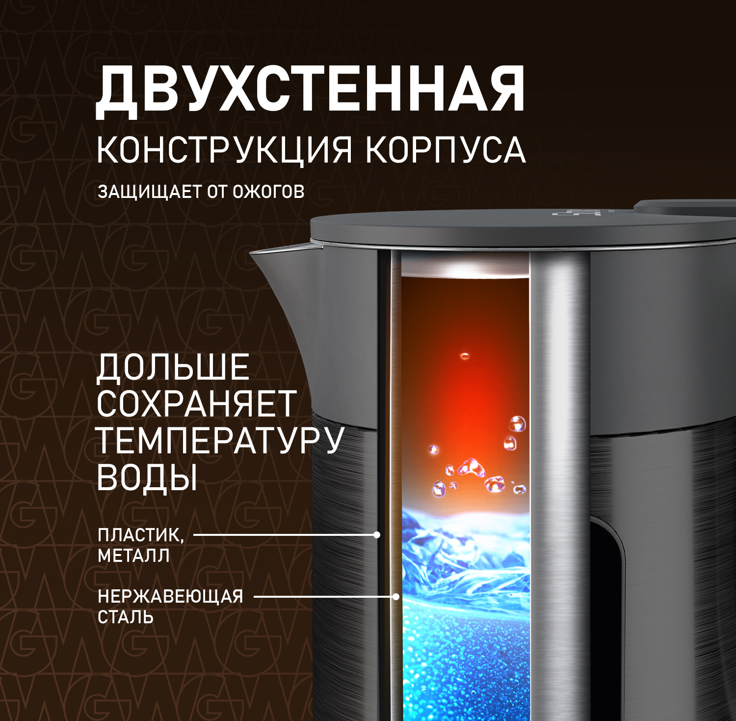 • Двухстенная конструкция, в которой наружная часть выполнена из экологически безопасного пищевого пластика и металла, внутренняя из экологичной нержавеющей стали обеспечивает эффект термоса. Благодаря такой конструкции наружная поверхность чайника не нагревается, о него невозможно обжечься, а при нагреве существенно снижается уровень шума и продолжительное время поддерживается температура воды!