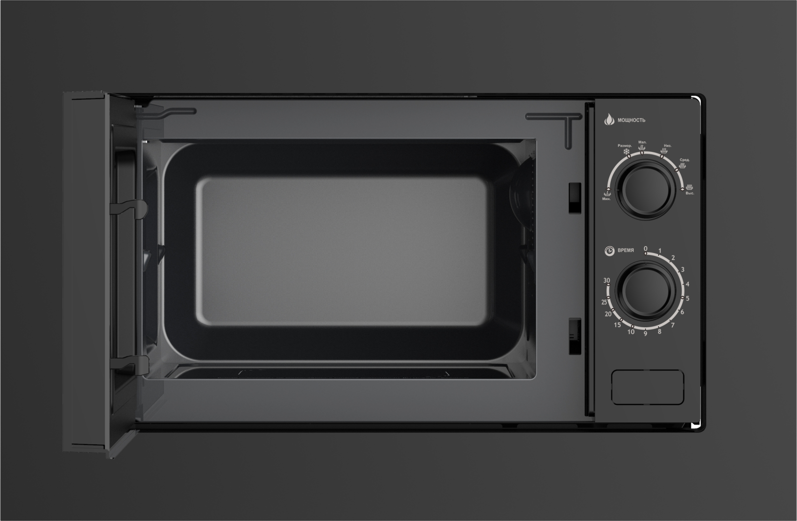 Встраиваемая микроволновая печь Weissgauff с объемом 20 литров, выполненная в черном цвете, оснащённая механическими поворотными рукоятками Soft Switch, равномерно разогревает еду без поворотного стола благодаря системе Spiegel!