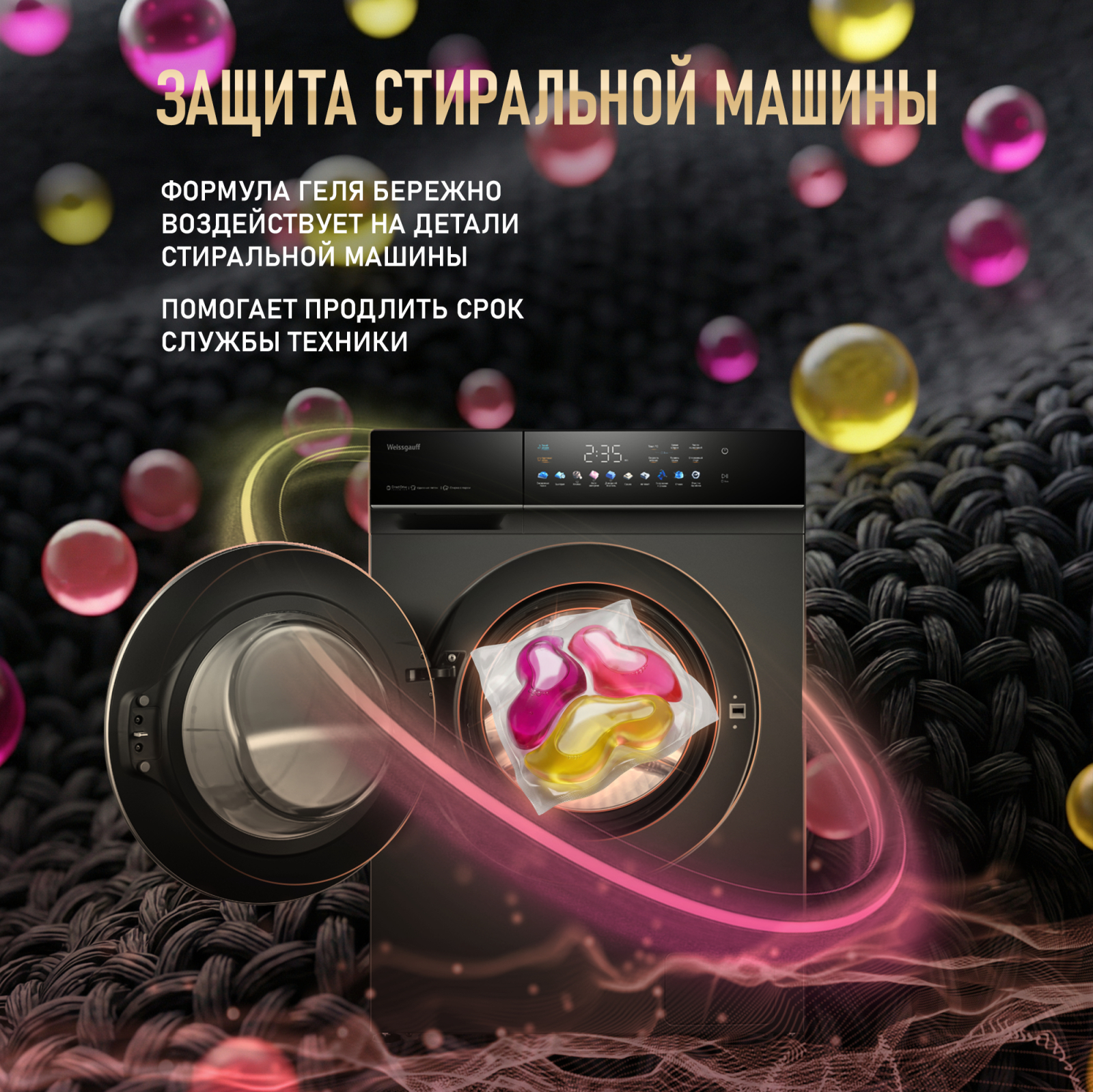 Регулярное использование капсул помогает эффективно удалять пятна, предотвращать образование катышков, устранять неприятные запахи и сохранять цвет ткани ваших любимых вещей!