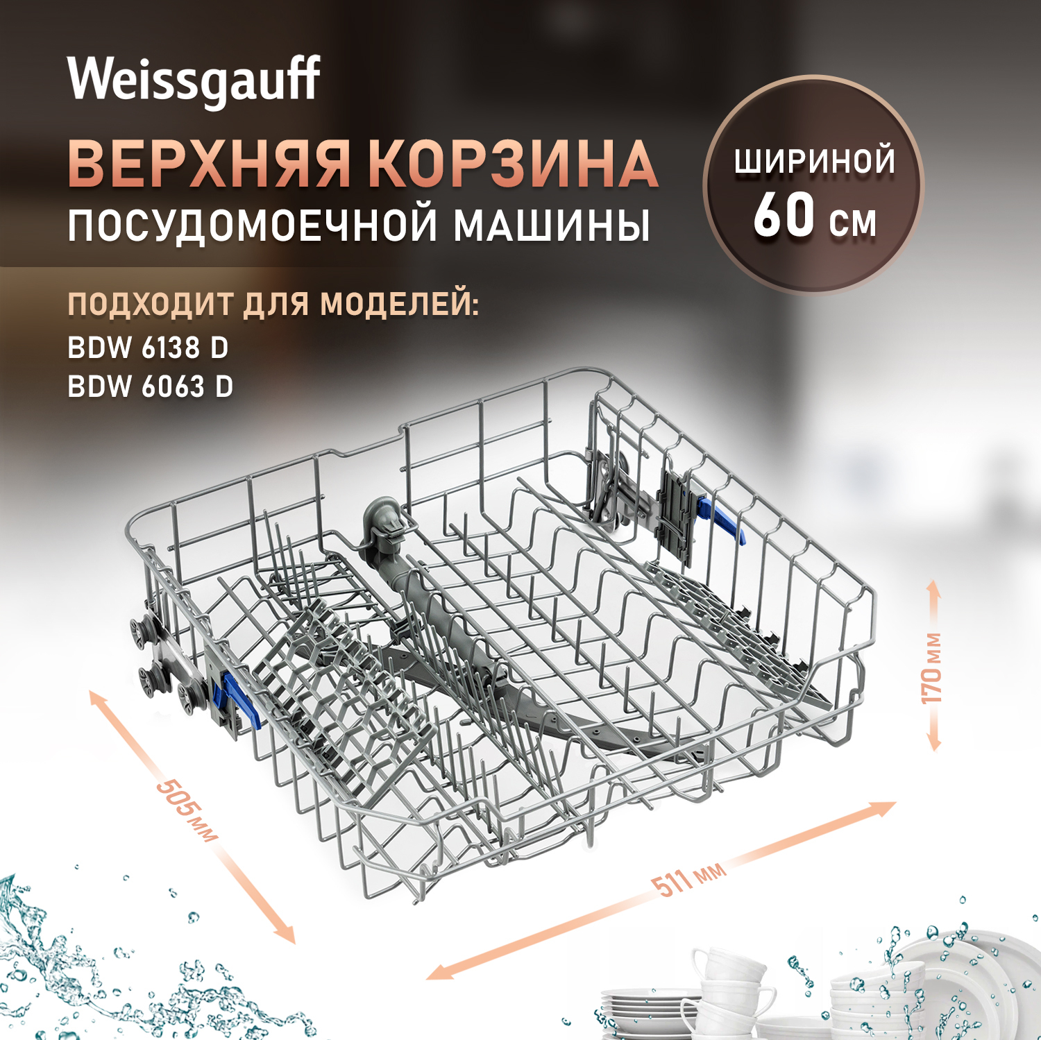 Верхняя корзина для посудомоечной машины шириной 60 см, предназначена для размещения мелкой посуды, обеспечивает оптимальное распределение предметов с целью максимального удаления загрязнений и обеспечения равномерного распределения водных потоков. В данную корзину рекомендуется помещать следующие типы посуды: