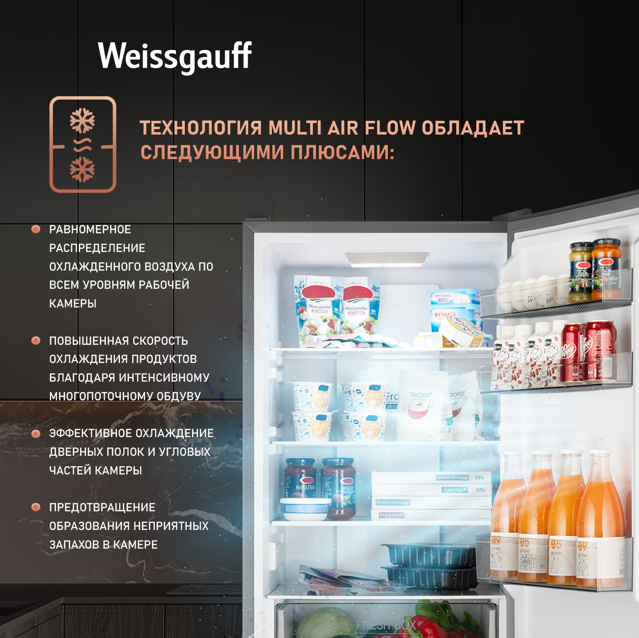 Технология Multi Air Flow, перенаправляет потоки холодного воздуха в обеих камерах вашего устройства для обеспечения наилучшего эффекта охлаждения помещенных продуктов!