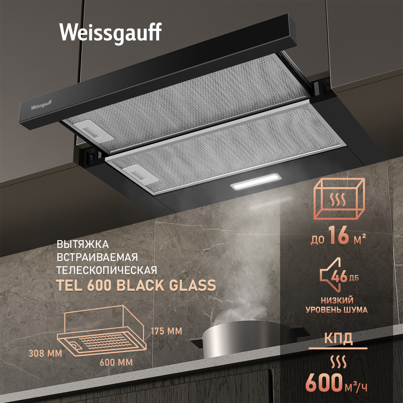 Встраиваемая в верхний подвесной шкаф телескопическая вытяжка от Weissgauff, обладающая впечатляющей производительностью 600 м3/ч и низким уровнем шума 46 дБ, выполненная в чёрном цвете, не только порадует своей функциональностью, но и станет настоящим украшением вашей кухни!