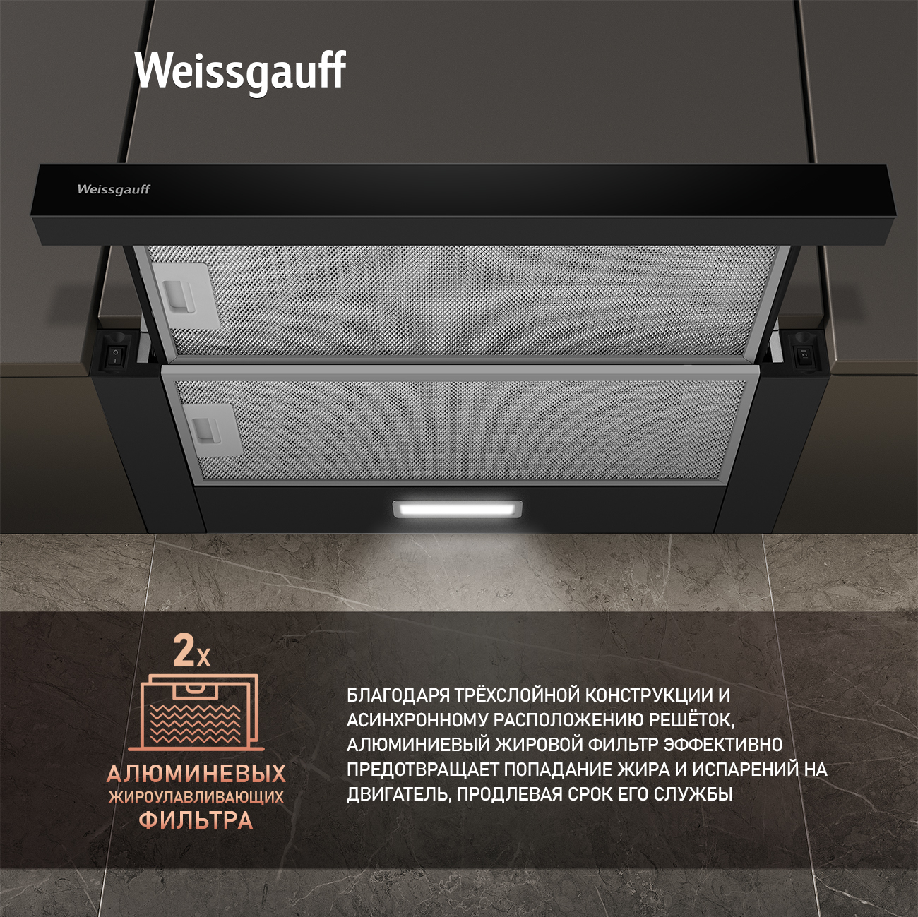 Алюминиевый жировой фильтр особой трёхслойной конструкции, с асинхронным расположением решёток, эффективно защитит двигатель от жира и испарений, продлив срок службы устройства.