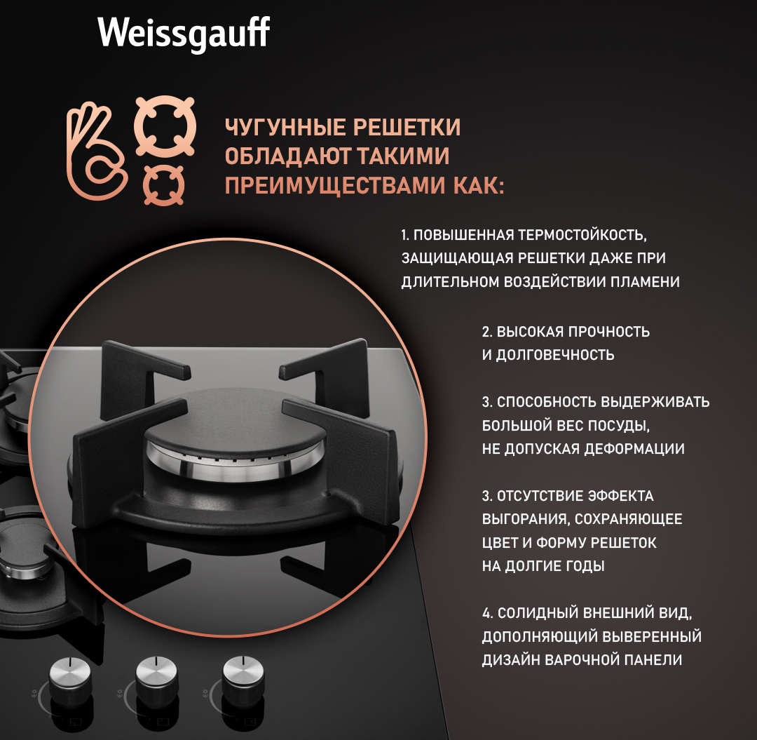 Решетки из высококачественного чугуна это неизменное качество, надежность и долговечность, воплощенные в каждой детали! Особая элегантность их дизайна не только послужит отличным дополнением к общему стилю варочной панели, но и существенно облегчит очистку и уход за ней. А благодаря особому вниманию Weissgauff к каждой детали, вы еще не раз оцените устойчивость и эргономичность этих решеток!