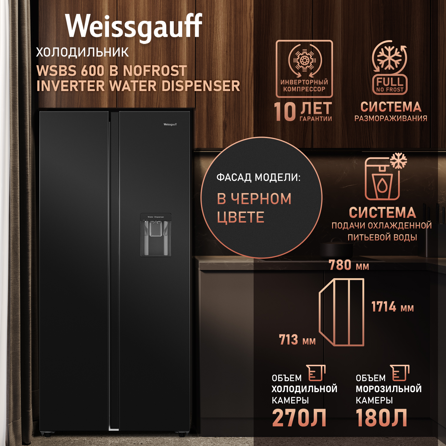 Габариты устройства 780 х 713 х 1714 мм - это оптимальные параметры для Side-by-Side модели, при выборе которых инженеры Weissgauff руководствовались целью создать для вас максимально вместительный и функциональный холодильник, который при этом окажется удобен в установке и не будет занимать лишнее место на вашей кухне!