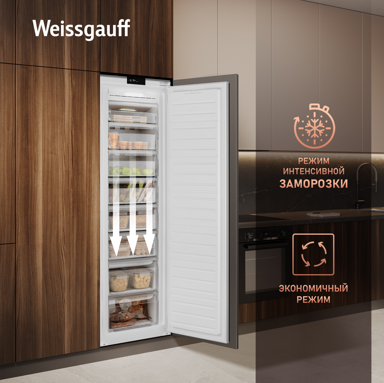 Встраиваемый морозильник Weissgauff с объемом морозильной камеры 221 литр, мощностью замораживания до 15 килограммов в сутки и полностью электронным управлением - это по-настоящему современный и вместительный помощник в хранении продуктов на вашей кухне!