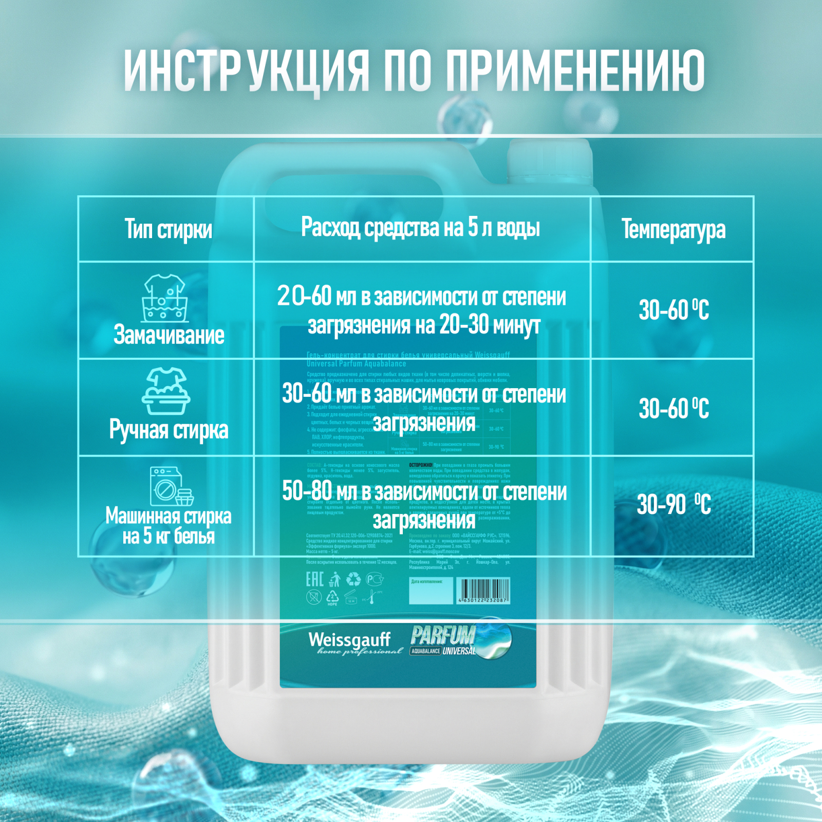 Гель-концентрат Weissgauff Universal Parfum Aquabalance объемом 5 литров предназначен для стирки любых видов ткани, в том числе деликатных, шерсти и шелка, кружева, вручную и во всех типах стиральных машин, для мытья ковровых покрытий, обивки мебели. Средство рассчитано на 250 стирок.