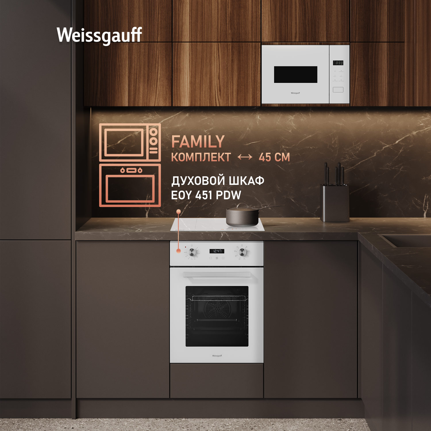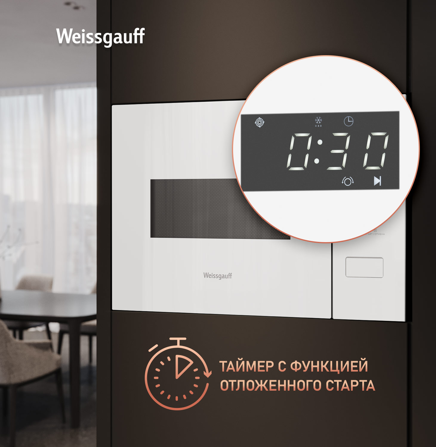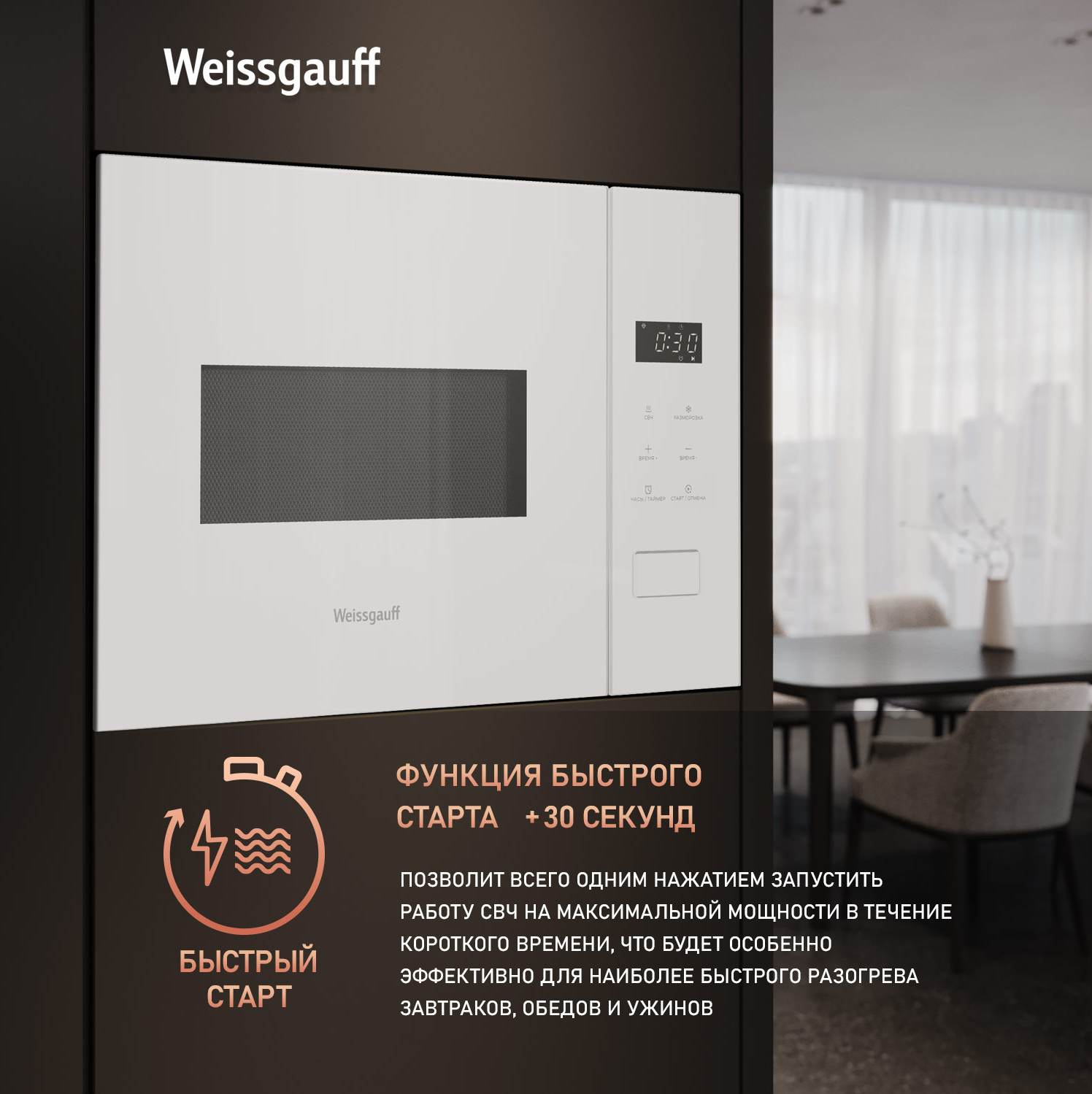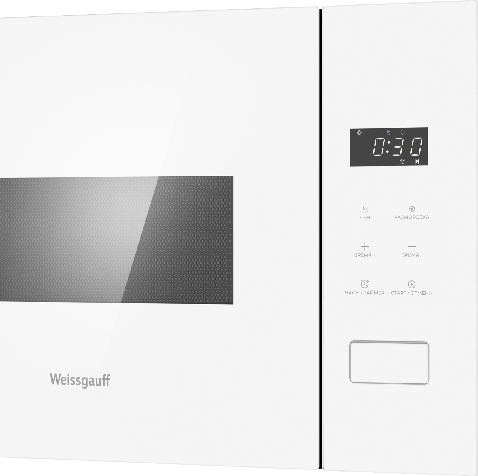 Встраиваемая микроволновая печь Weissgauff шириной 45 сантиметров, выполненная в белом закаленном стекле с сенсорной панелью управления, имеющая объем 20 литров - это настоящее воплощение основного принципа Weissgauff: "Качество, доступное каждому"