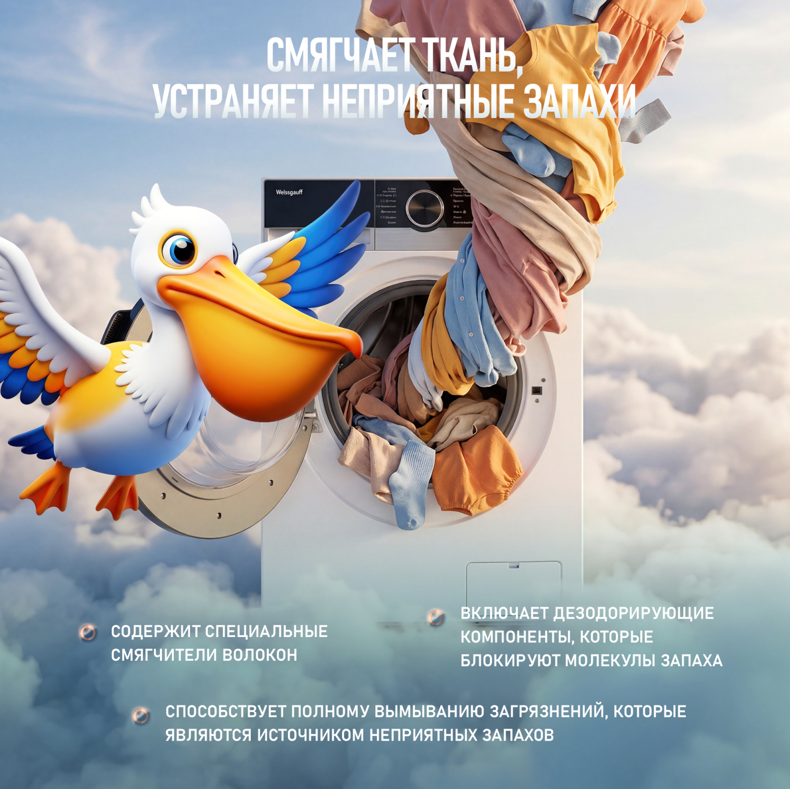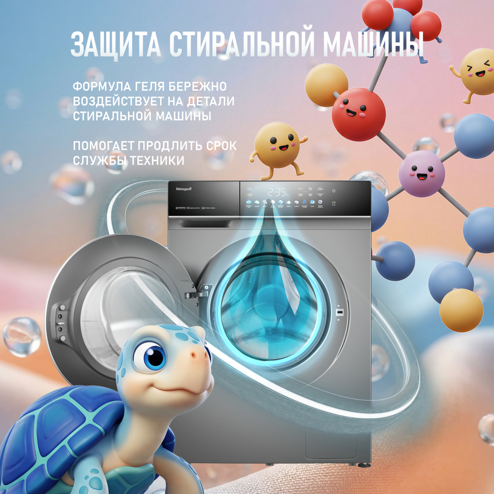 Формула бережно воздействует на детали стиральной машины, помогает продлить её срок службы и идеально подходит для техники Weissgauff и других автоматических машин и ручной стирки!