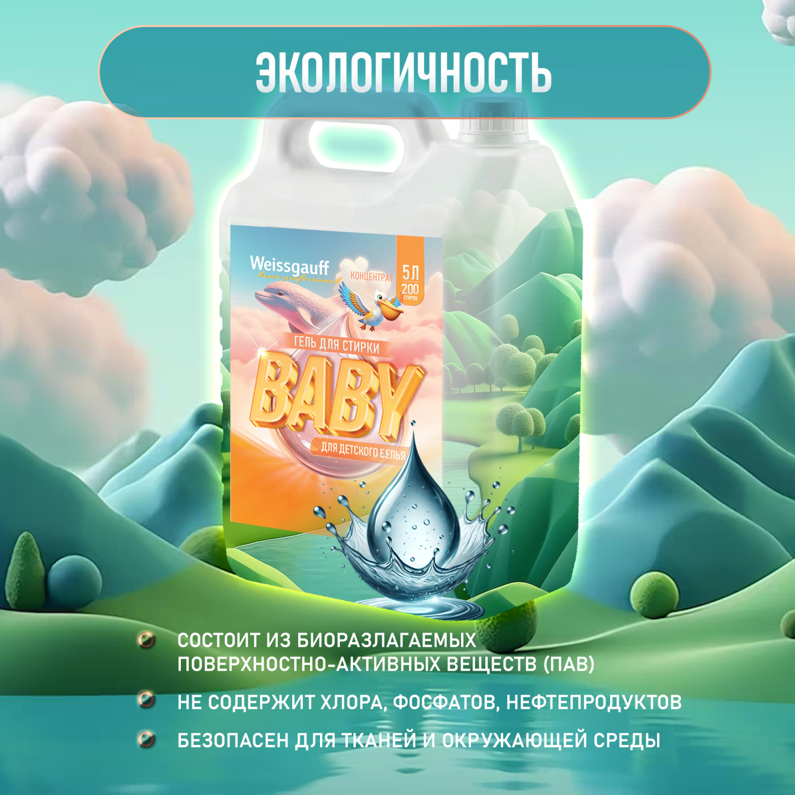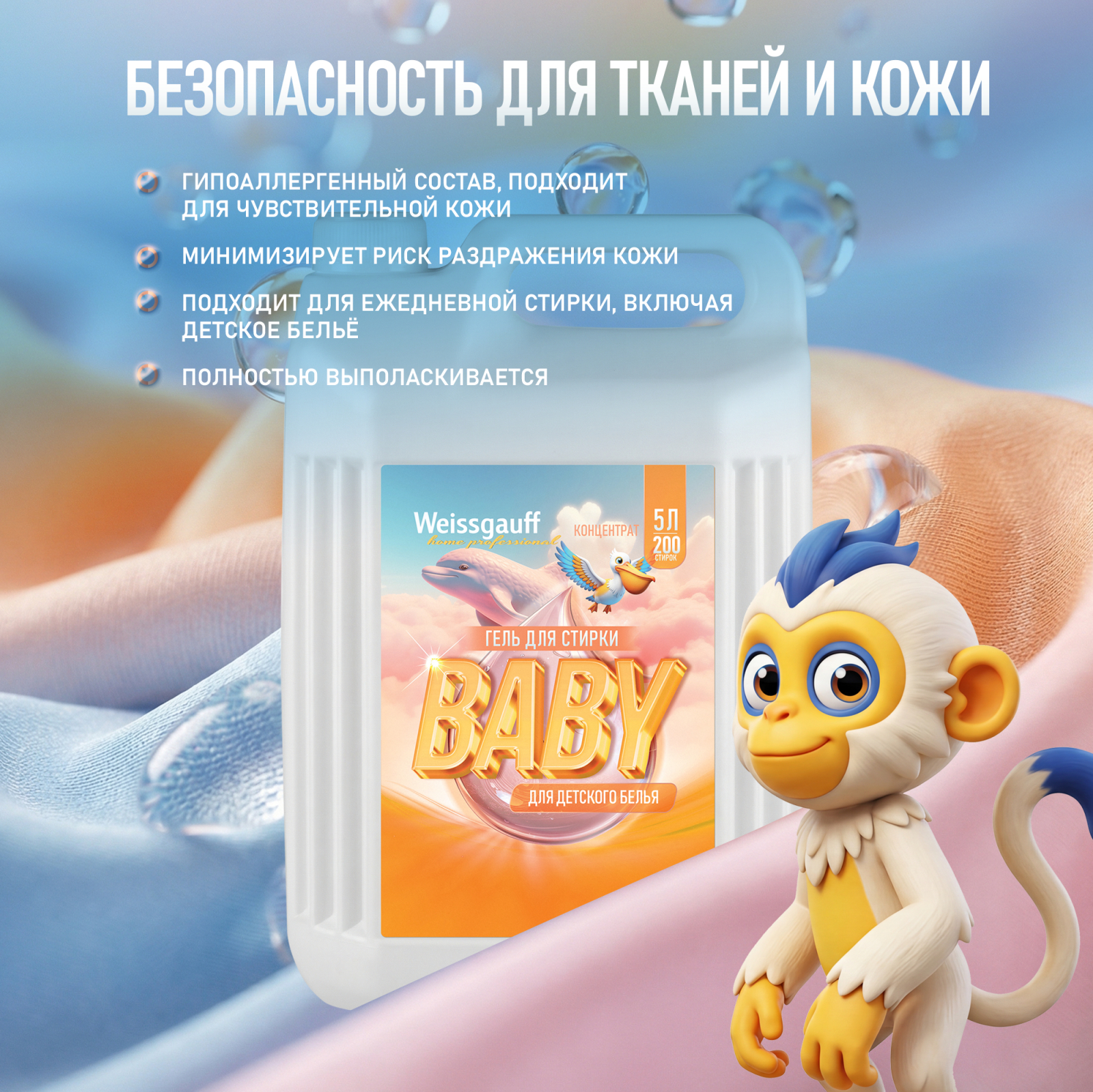 Гель-концентрат Weissgauff Baby представляет собой инновационное средство для стирки детского белья, разработанное с учетом строгих требований к безопасности и эффективности. Продукт предназначен для стирки белья из различных типов тканей, включая деликатные материалы, как в ручном режиме, так и в автоматических стиральных машинах.
