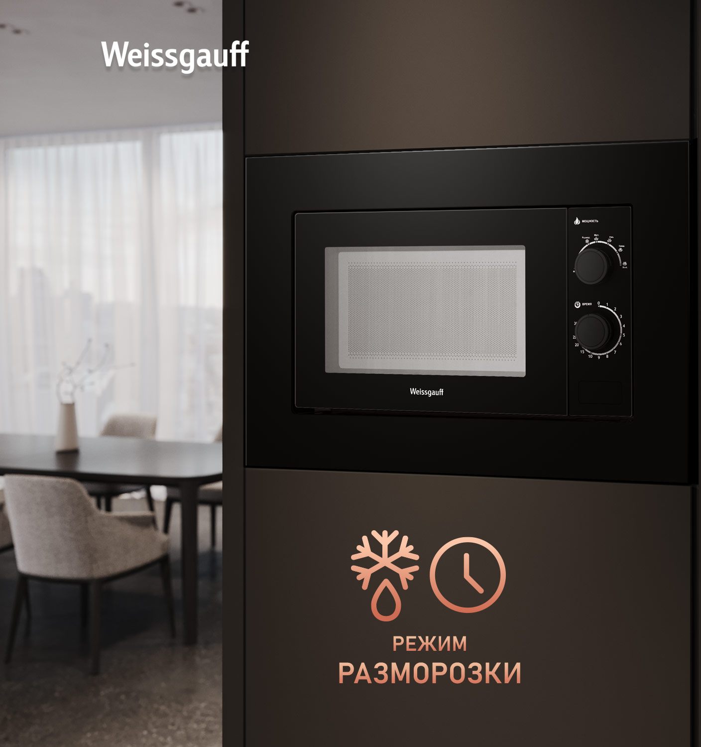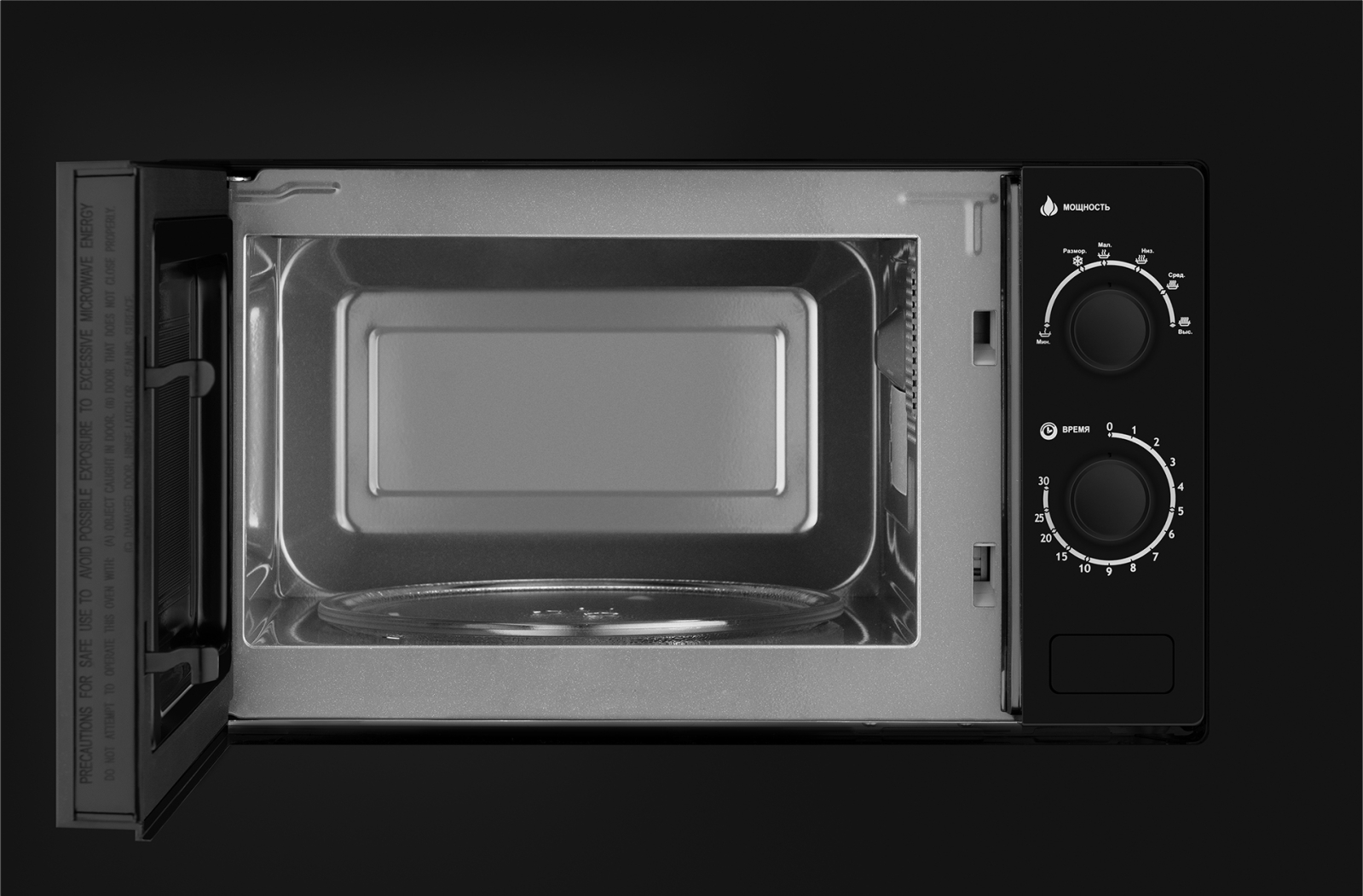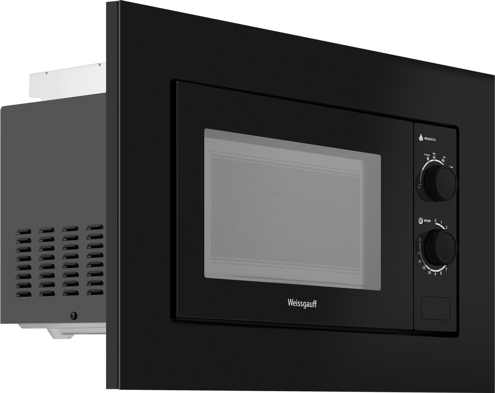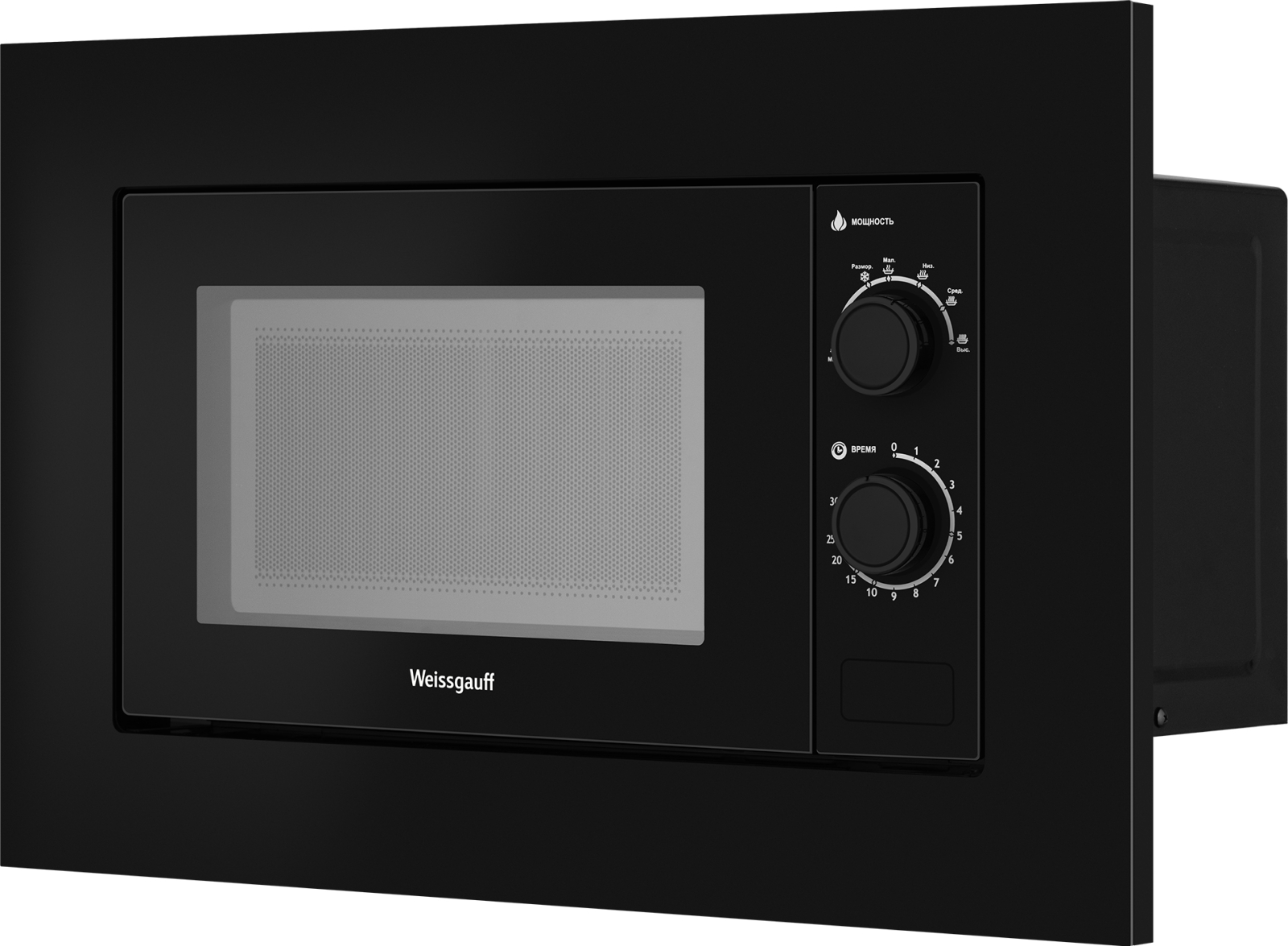 Встраиваемая микроволновая печь Weissgauff с объемом 20 литров, выполненная в черном цвете, оснащённая механическими поворотными рукоятками Soft Switch, равномерно разогревает еду при помощи поворотного стола!