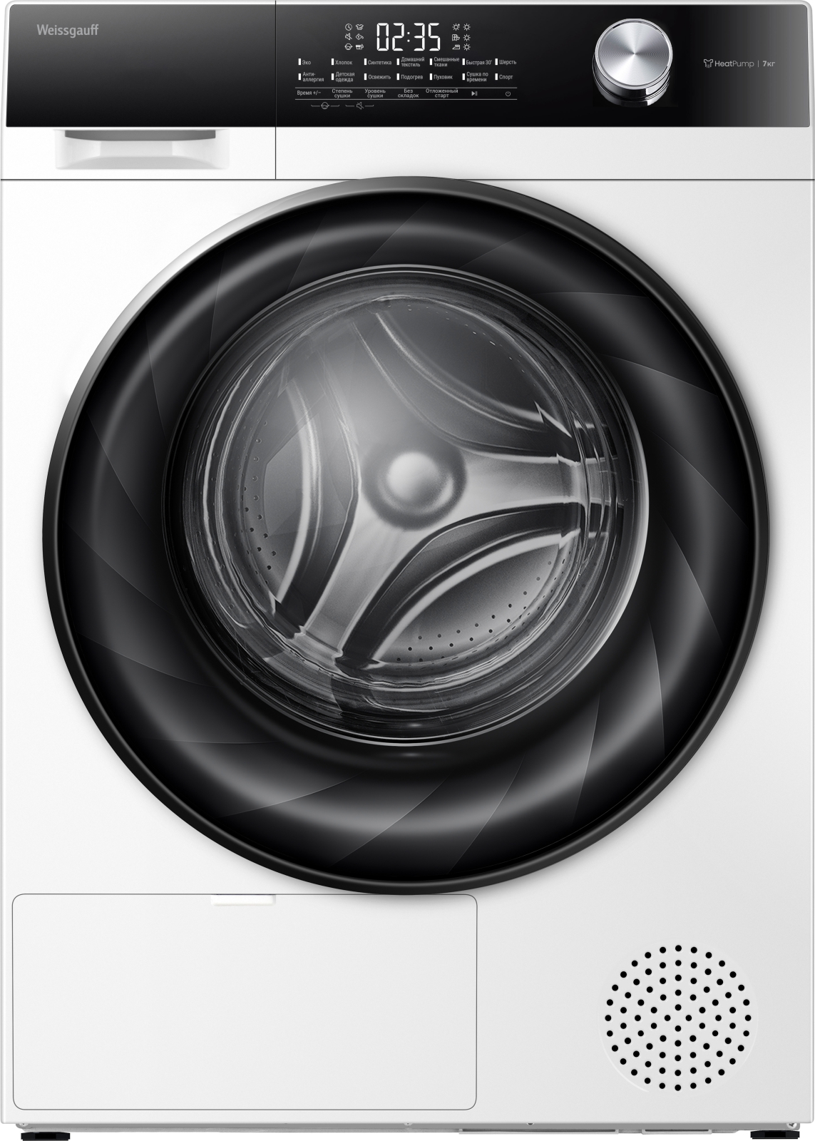 Отдельностоящая сушильная машина Weissgauff, оснащенная тепловой помпой, имеющая впечатляющий показатель загрузки до 7 килограммов белья, и полностью электронное управление, станет для вас гарантией непревзойденной эффективности и высокого результата при каждом запуске этой великолепной модели!