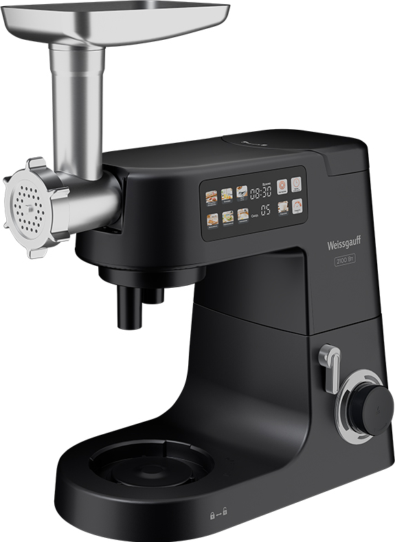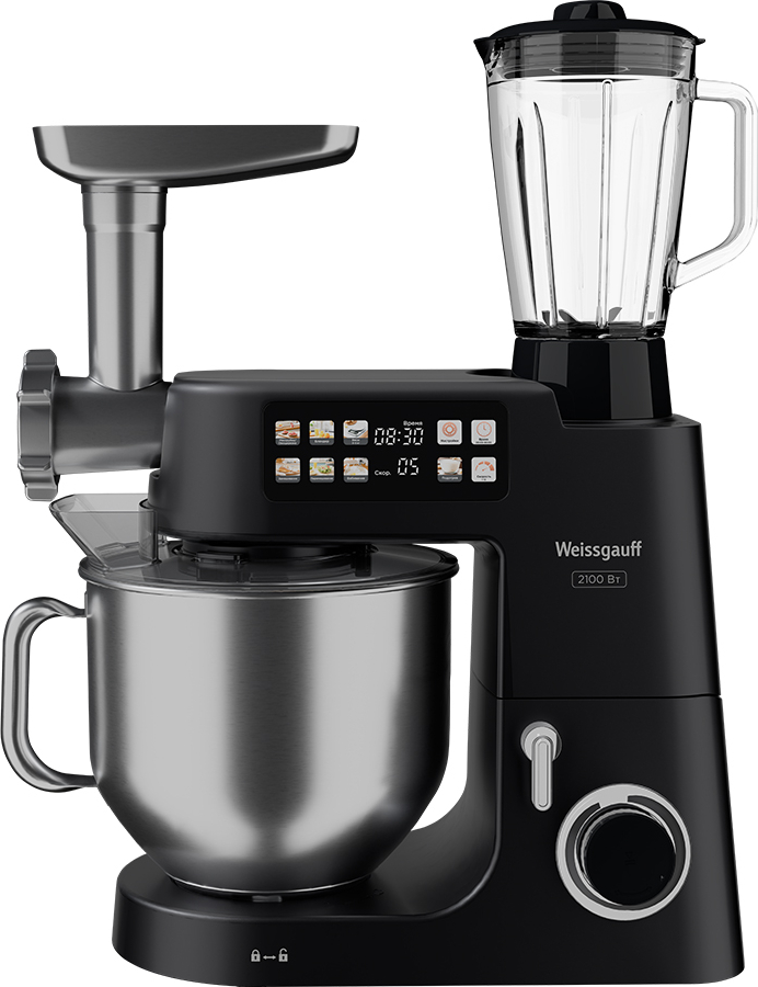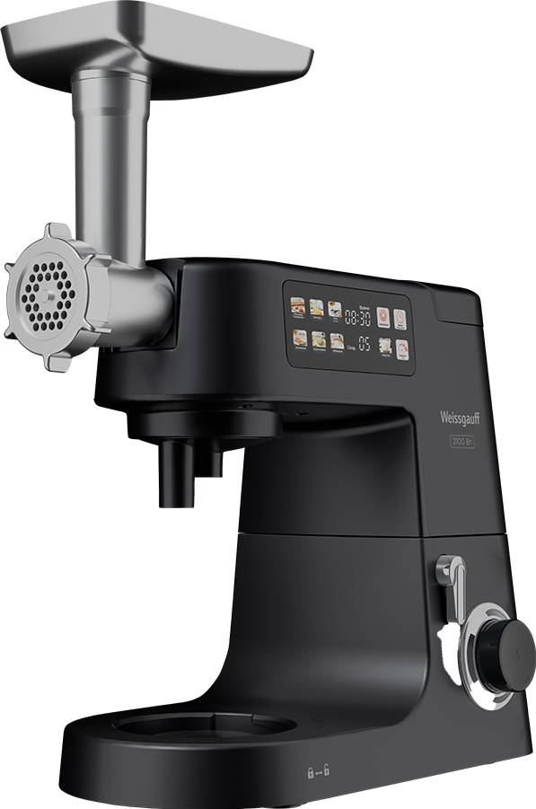 Современная многофункциональная 7 в 1 кухонная машина Weissgauff мощностью 2000 Вт с чашей объемом 8 литров из нержавеющей стали станет стильным дополнением в любой интерьер, а её максимальная комплектация, включающая миксер, мясорубку, тестомес, овощерезку, блендер, расстойку для теста и весы, сделает прибор вашим незаменимым помощником на вашей кухне, который поможет вам воплотить в реальность самые смелые кулинарные идеи!